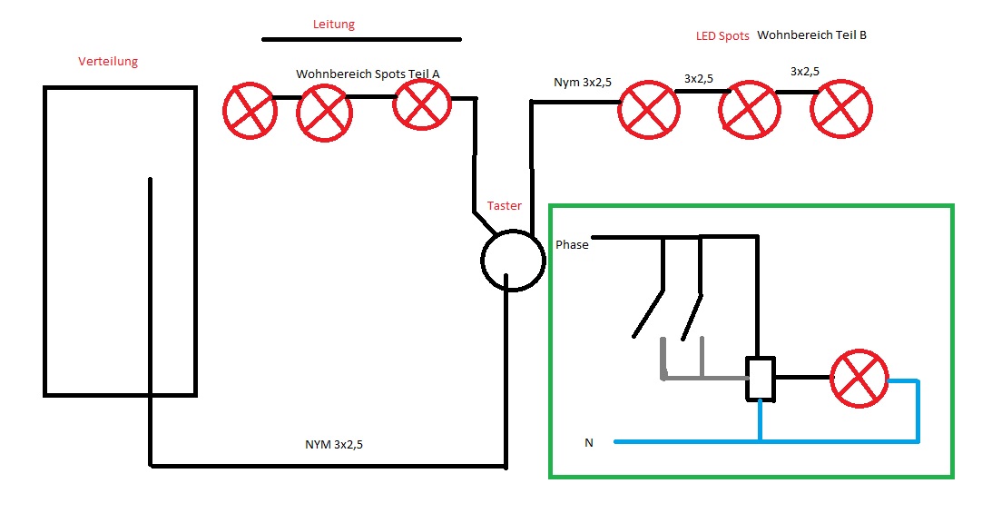 Mit einem zusätzlich Kabel wäre es leicht losbar. So ganz verstehe ich den Aufbau bei euch noch nicht. Habt ihr Leerrohr bis zu den Spots? Dann müsst ihr dort einfach ein 3x1,5 einziehen bis zur Verteilung. Oder geht das Leerrohr nur bis zum Schalter? Im Grunde würde es dann gehen.