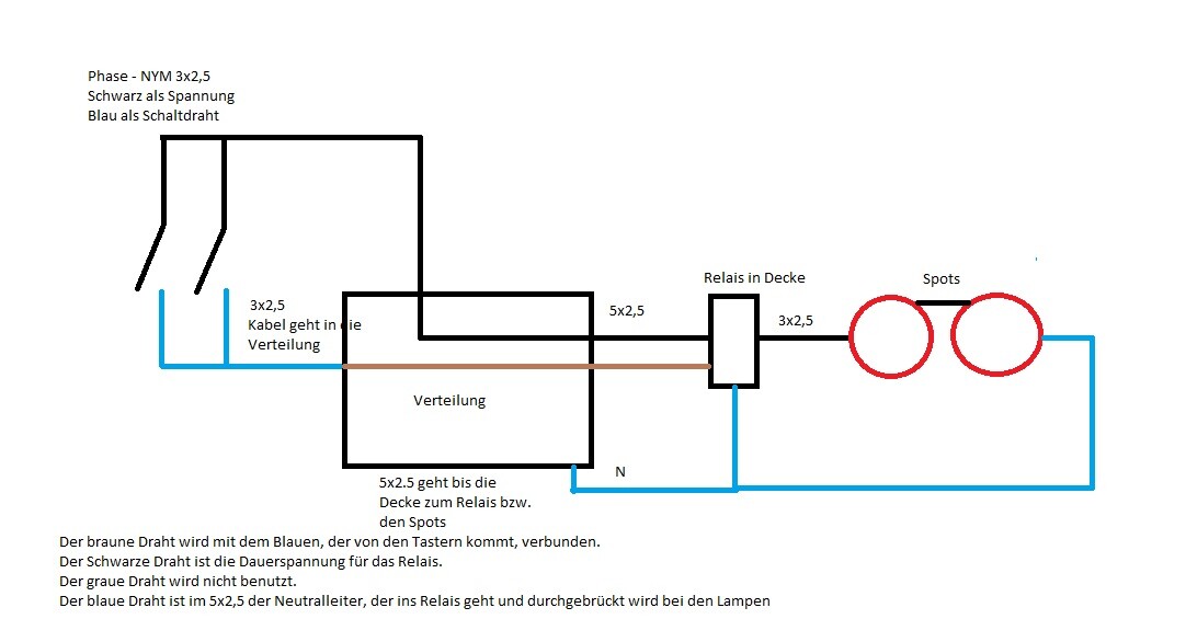 Also muss der blaue geschaltet werden. In der Verteilung wird der Blaue mit dem Braunen verbunden über eine Klemme. Also wird das "Signal" quasi durch die Verteilung weitergeleitet bis zum Relais.