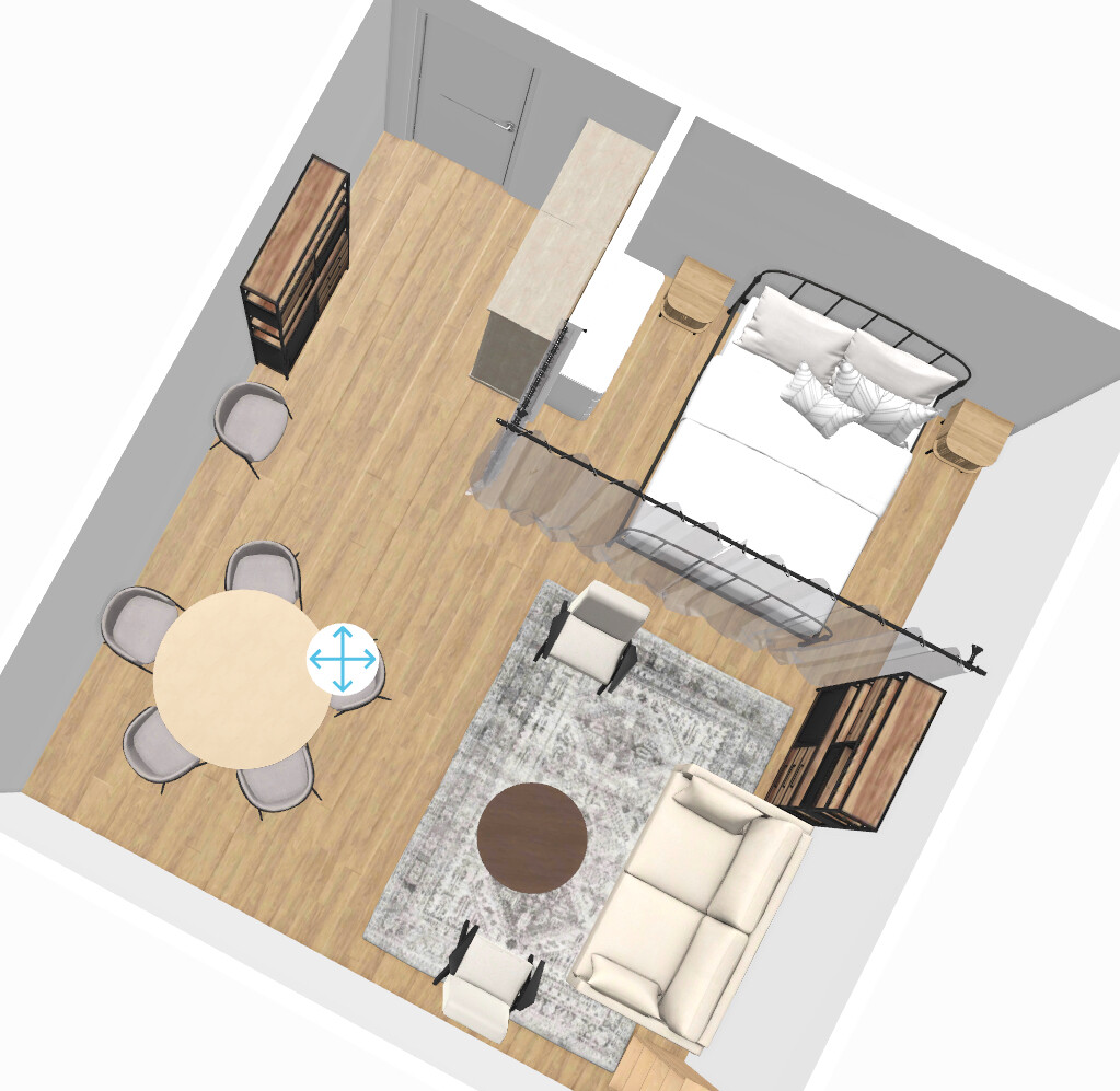 Offener Wohn-/Schlafbereich mit Bett, Sofa, Sessel, runder Esstisch und Regal