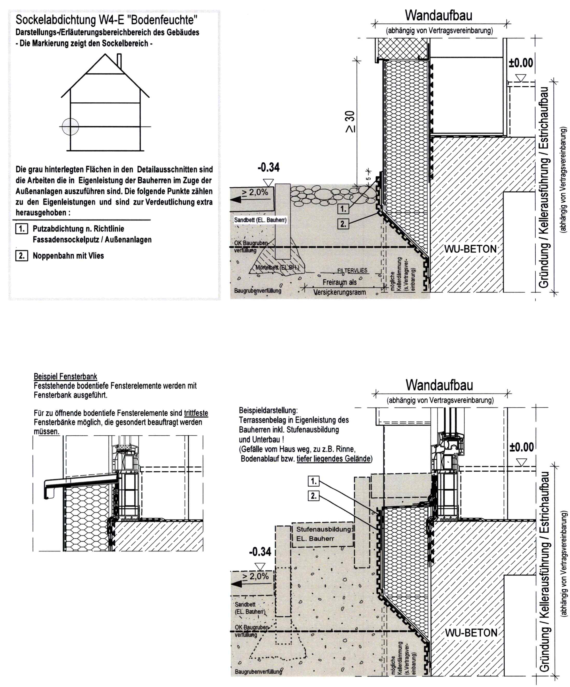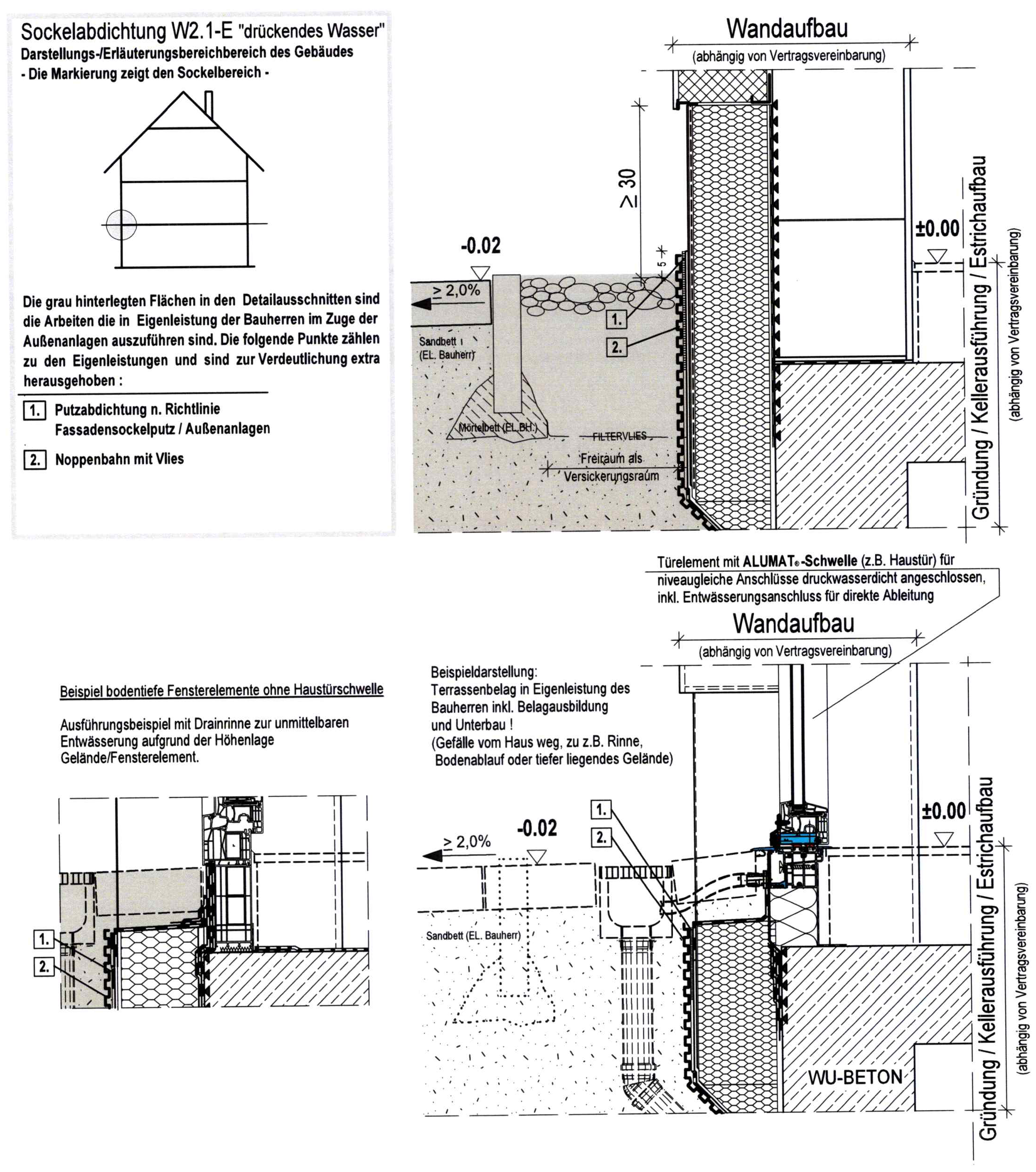 Vielleicht helfen die beiden angehängten Varianten weiter. Die Variante mit der Birco-Rinne - Weiß jemand was die Sache für eine bodentiefe Tür kostet? - ist ziemlich aufwändig. Vorteil: Ebenerdige Terrasse. Nachteil: Hohe Kosten, Reinigung der Rinne ggf. nötig. Zu Bedenken ist auch, dass Lichtschächte anders gesichert werden müssen, da sie oft nur durch eine seitlich offene, schräge (Plexi)Glasabdeckung geschützt sind. Da würde dann munter das Wasser reinfließen. Man muss also rings um die Lichtschächte eine Art "Schutzwand" haben.