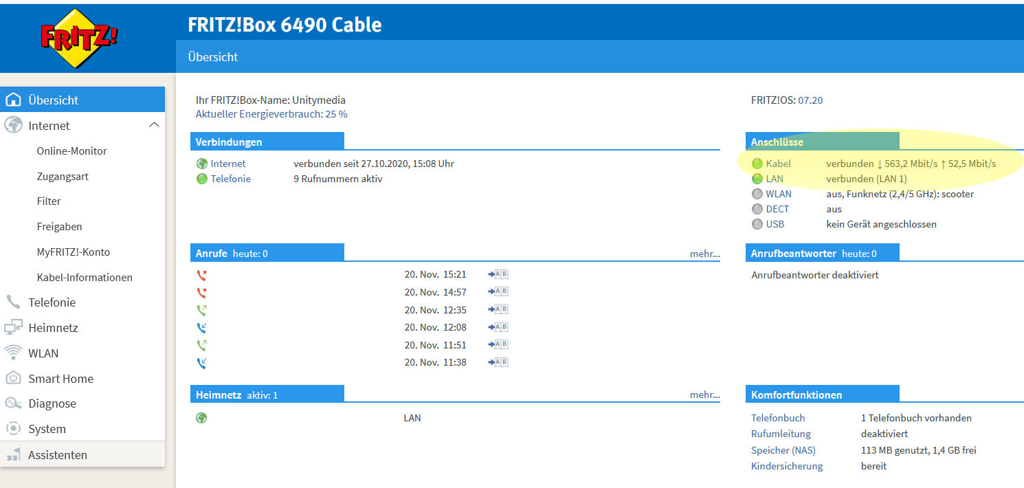 Bei dem Router scheint was falsch eingestellt zu sein. Die LAN-Verbindung ist deaktiviert. Ich finde nichts zum einstellen. Somit konnte ich auch noch nicht messen.