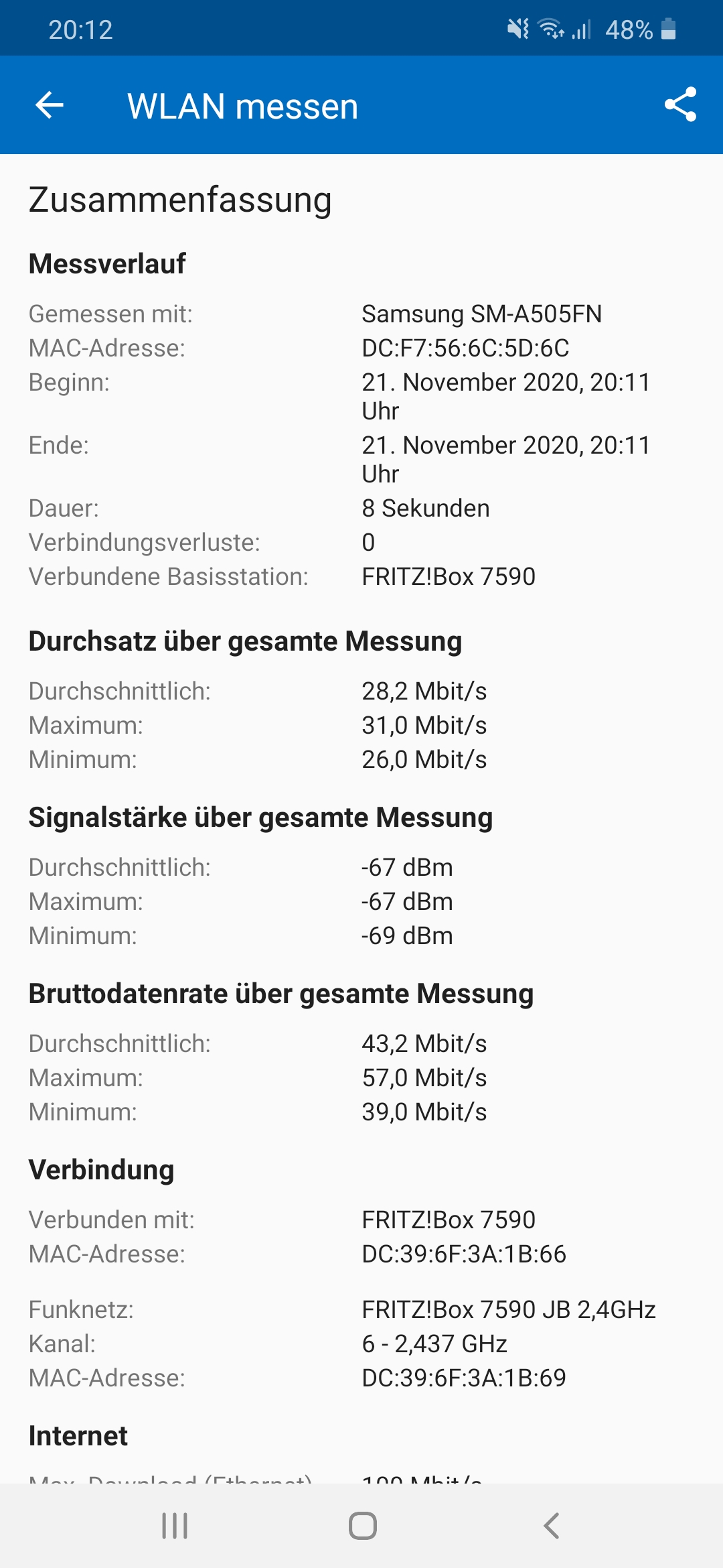 WLAN-Messbildschirm mit Zusammenfassung und Messverlauf (Samsung SM-A505FN, FRITZ!Box 7590).