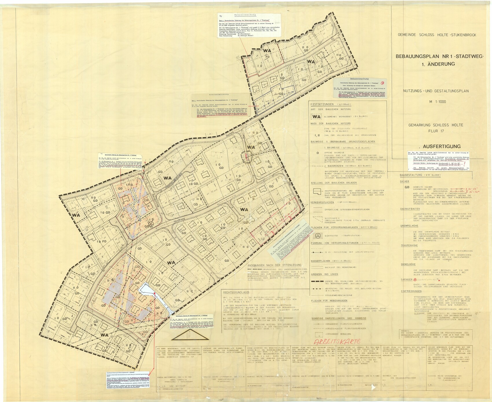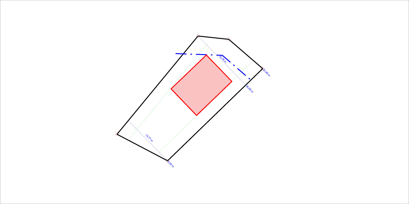 Eine weitere Schwierigkeit bei Dir ist, dass die Baugrenzen im Bebauungsplan weder maßlich noch geometrisch festgelegt sind, insbesondere die an der Wendehammeraufweitung. Ich habe sie mal graphisch übertragen. IMHO steht 9m*12m Grundfläche nichts entgegen, egal ob parallel zur Nord-West- oder Süd-Ost-Grenze.