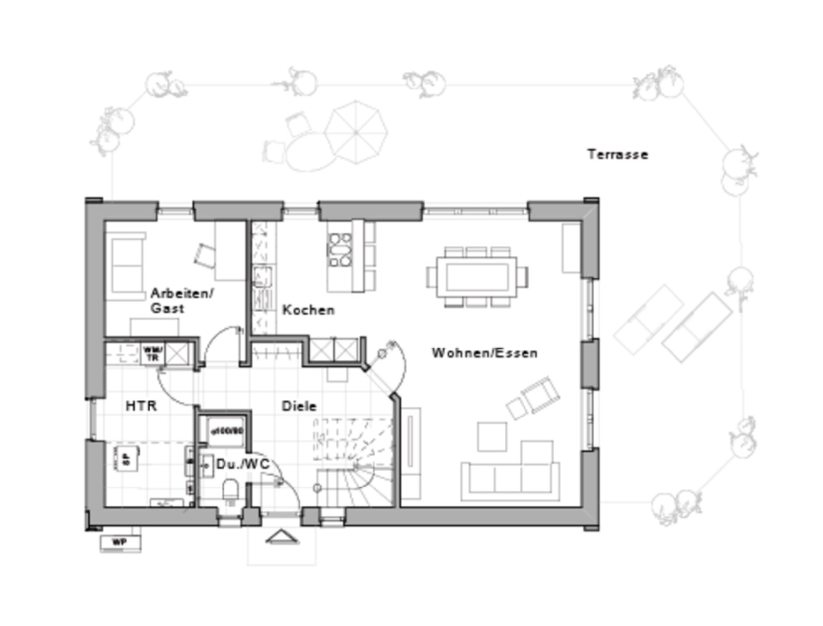 Noch einfacher und ganz klassisch. Tu die Küche in den Raum, der nun. Gast heisst. Verbinde diese per Tür mit HTR. Da rein Waschmaschine, Trockner, TK Schrank, Vorratsregale Ikea Ivar. Das ist nun die Wirtschaftszone. Die Wohnzone besteht dann aus dem Platz der Küche, wo sie nun ist und dem Raum, wo nun der Tisch ist. Dann wo jetzt die Couch steht kommt per Wand abgetrennt Gast hin. Überleg mal, ob das nicht am praktischsten ist.