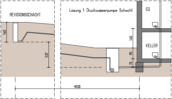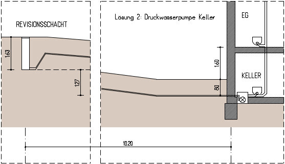 Dazu würde ein neuer Schacht mit einer oder zwei Pumpen vor dem Haus gebaut werden. Das Abwasser wird darin gesammelt, zerhäckselt und mit einer frostfreien 40m Druckleitung zum Rev-Schacht gepumpt. Nach meiner Ansicht brauche ich hier keine "Schleife" die das Wasser über eine Stauebene hebt, denn der Revisionsschacht selbst liegt schon sehr hoch (über dem Geländeniveau am Haus). So müsste es hoffentlich gehen, aber leider ist das auch eine sehr kostspielige Lösung (Material alleine um 10.000€).