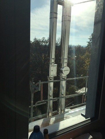Nun wurde diese Woche der Edelstahl Außenkamin (2Rohre) ca. 35cm neben unserem Schlafzimmer an der Außenwand installiert