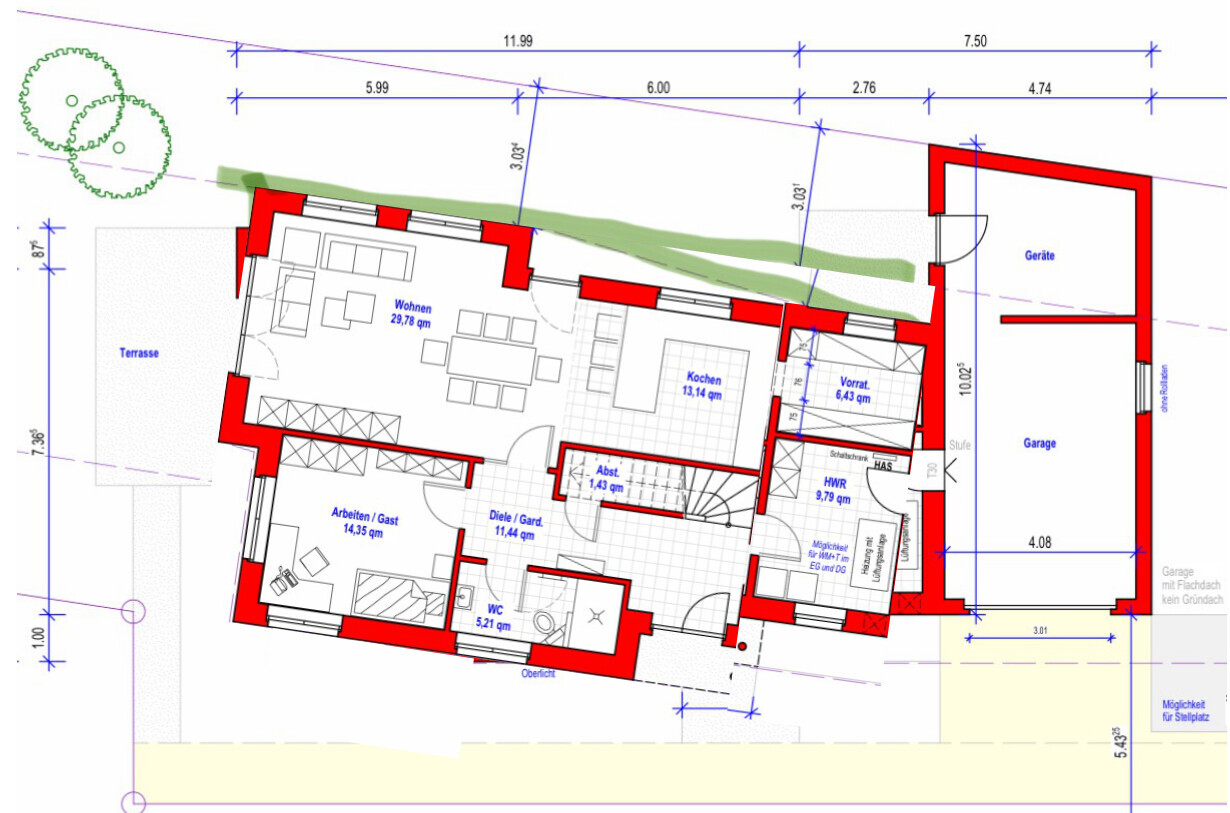 Den "Keil" zwischen Hauswirtschaftsraum und Garage könnte man der Garage zuschlagen, kleiner Abstellplatz für Fahrräder oder so.