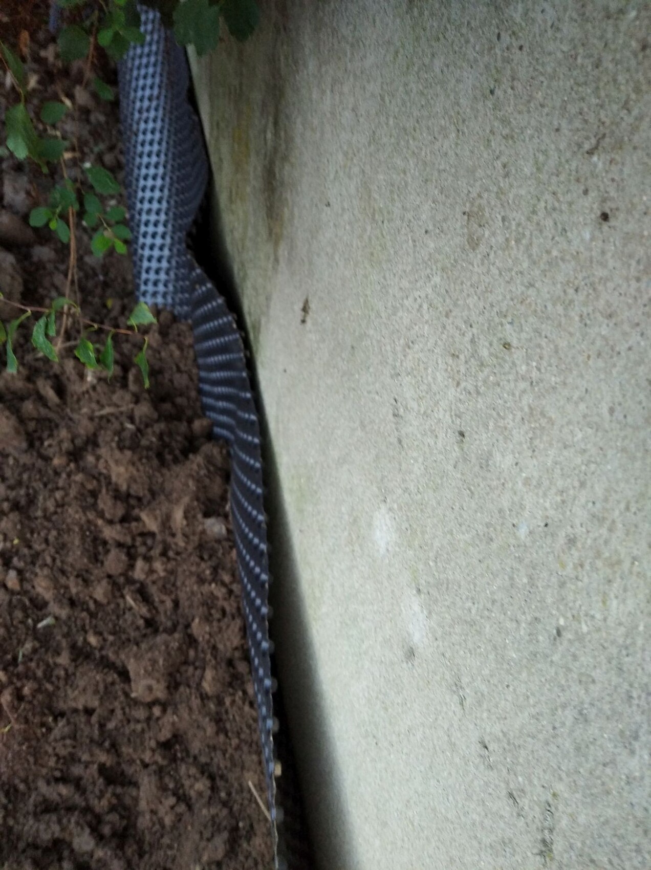 Baustelle: Schwarze Drainagematte liegt entlang einer Mauer, Erde davor, Bepflanzung links.