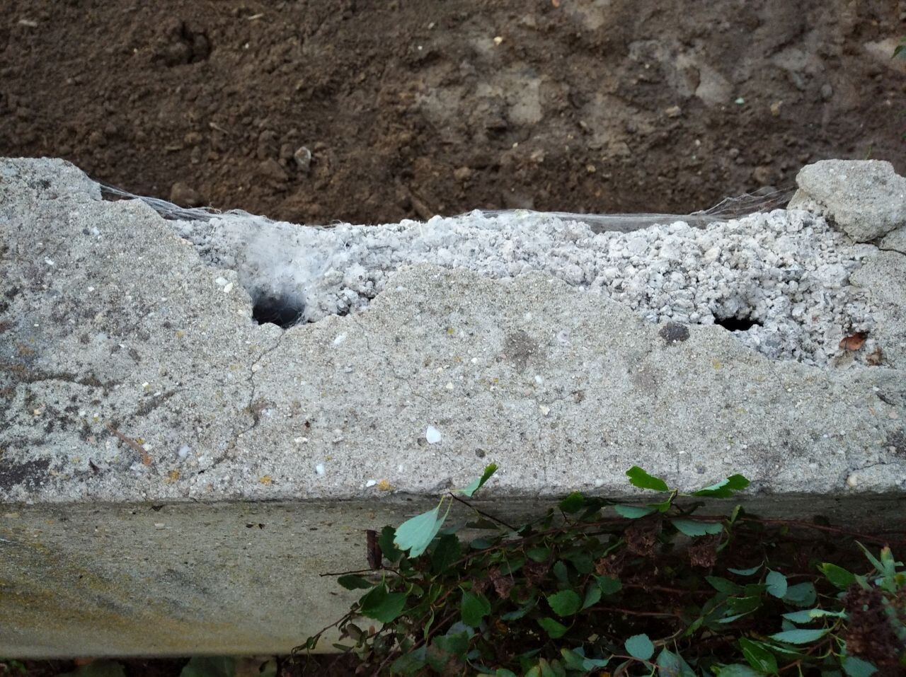 An einer Stelle, an der dieser (Schalungs-)Zement letzten Winter abgeplatzt ist, konnte ich das jetzt alles gut erkennen. Und ja, diese Stelle wird vor diesem Winter noch repariert