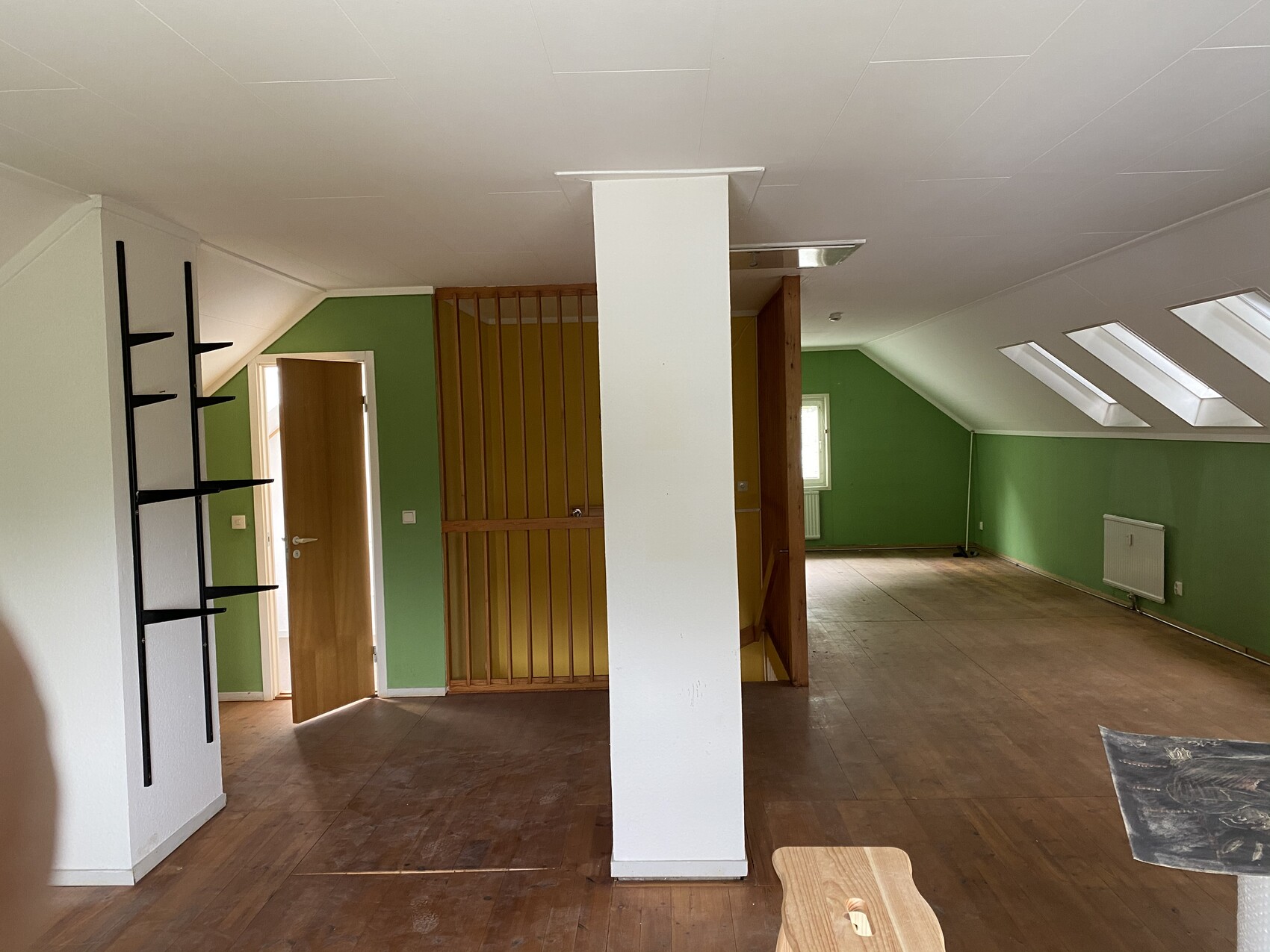 Erdgeschoss und Dachgeschoss, Bad, Toilette, Türen, Heizung, Boden, Wände und Außenfassade die aus Holz ist.