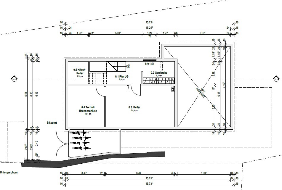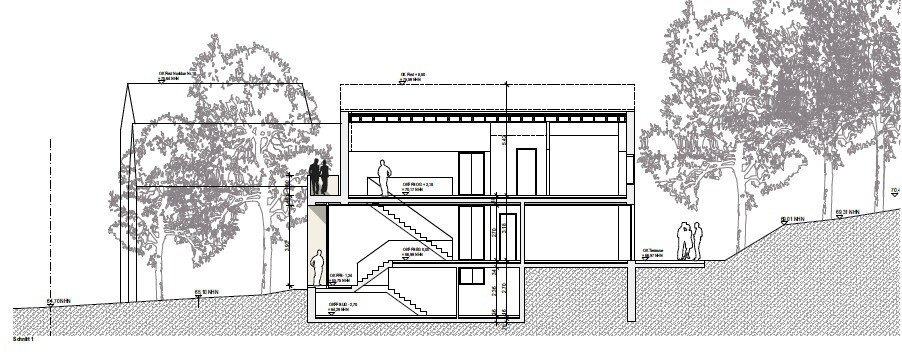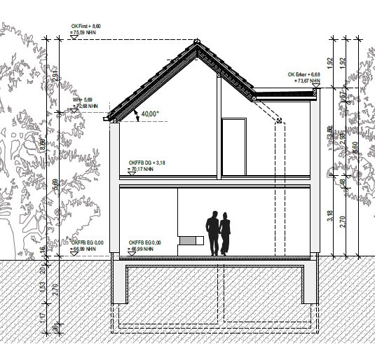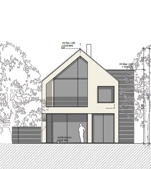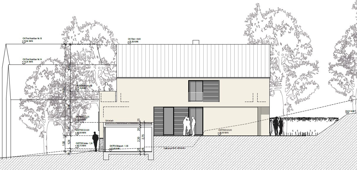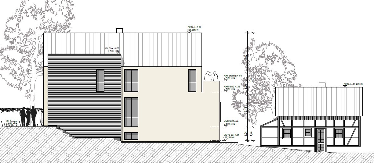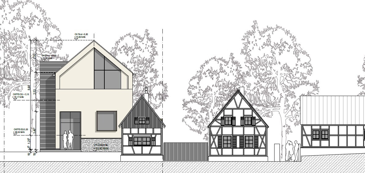 Fast ein halbes Jahr später können wir endlich Richtung Bauantrag schreiten. Wir hatte sehr viel mit dem Denkmalamt diskutiert und Pläne gewälzt. Am Ende konnten wir den Baukörper so umsetzen, das Dach musste aber wegen Schutz des Esembles etwas steiler und die Fenster kleiner. Leider hat die Treppe mit dem Absatz in der Mitte nicht funktioniert, so dass diese nun mit einem langen Aufgang längs in den Flur gewandert ist.
