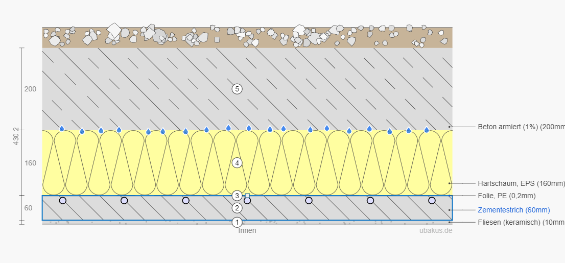 Ihr haltet es für möglich, 40° warmes Wasser durch die Rohre laufen zu lassen, ohne, dass die Oberflächentemperatur 27°C überschreitet?Dafür gibt es einen Rechner im Netz. Wie der Abakus, fängt nur mit u an.Ich habe mal pauschal ein paar Daten eingegeben. Da kommt bei 40 Grad Vorlauf eine Oberflächentemperatur von 35,6 Grad raus (60er Estrich mit 40mm Überdeckung, 150mm Verlegeabstand und 16er Rohr. Also nein, das klappt nicht bei meinem Musteraufbau. Ich denke, dass es aber fast egal ist, wie der Aufbau wird und im Zweifel schwimmendes Parkett verlegt, es dürfte annähernd immer die 27 Grad überschreiten.