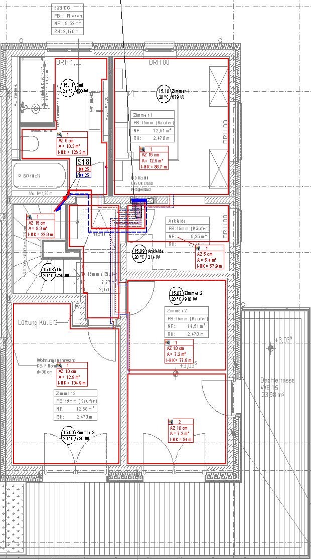 - Die Norm Heizlast müsste doch die zusätzliche notwendige Heizlast bereits beinhalten, oder? Bspw. Hat Raum 15.01 1912W Heizlast und hiervon werden 490 W für die Erwärmung der Zuluft genutzt, korrekt?Das ist eine gute Frage. Ich vermute eher, dass man die zusammenrechnen muss.Es ist meiner Meinung nach aber falsch, dass die Bäder keinen Lüftungsverlust haben.
