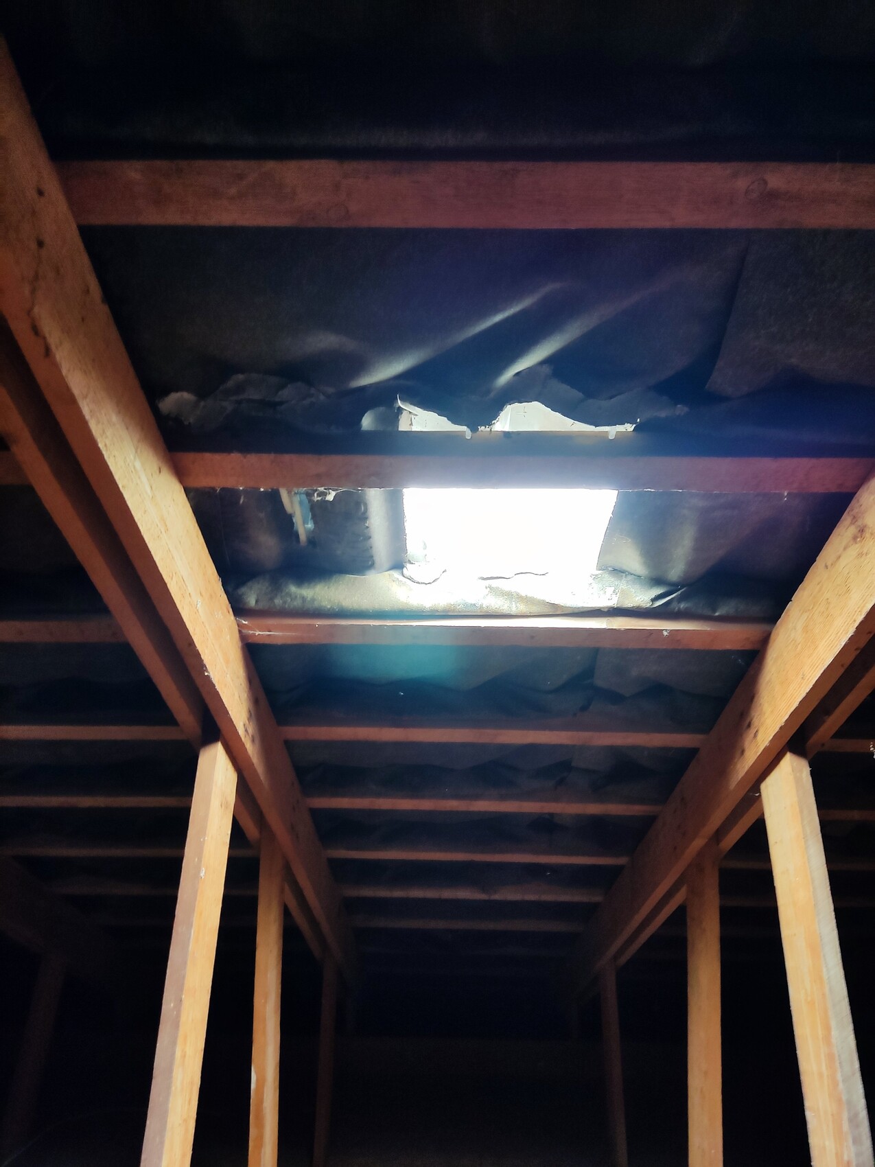 Über beiden Bereichen (Anbau und Ursprungsbau) sind Dielen vernagelt für die Begehbarkeit.
