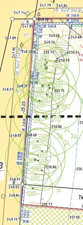 Auf dem Lageplan (nach Norden ausgerichtet) sind die verschiedenen Bäume zu sehen (es sind alles Pappeln) und auch der Hang mit Höhenmetern eingezeichnet: