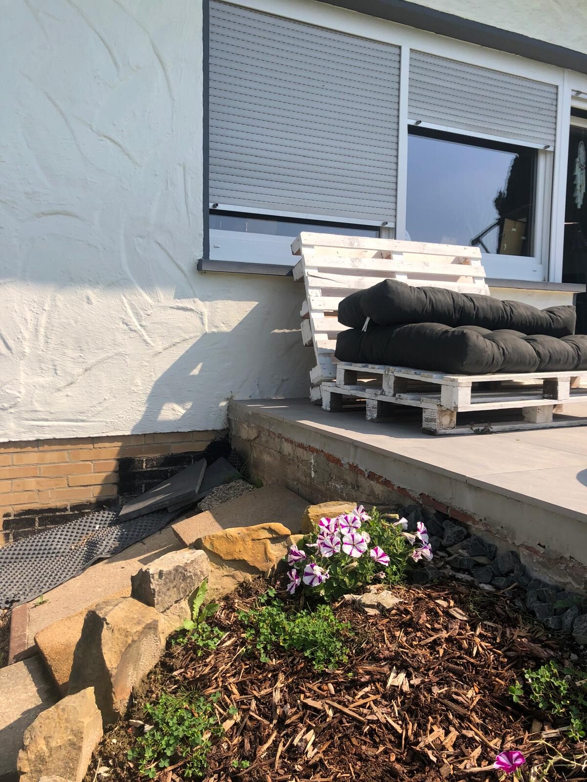 Hatte schon überlegt ob man eine Palette auseinandersägen kann und aufeinander stapeln kann bis die Höhe des Terrassenbodens erreicht ist.