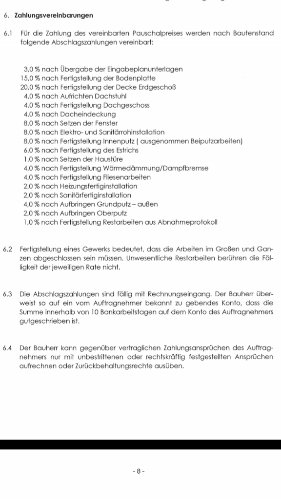Abgesehen von den vielen Zahlungsschritten würde mich der Punkt 6.2 stutzig machen. Was bedeutet im großen und ganzen? Dieser Begriff ist genauso dehnbar wie Ein Kaugummi.