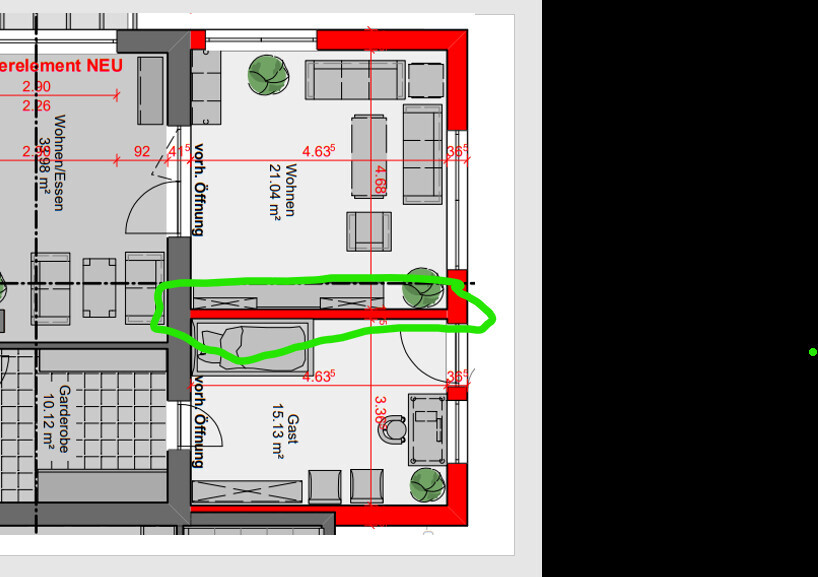 Grundriss eines Wohn- und Essbereichs mit Gastzimmer; grüne Markierung eines Durchgangs.