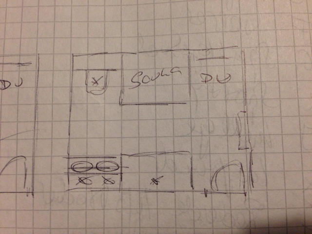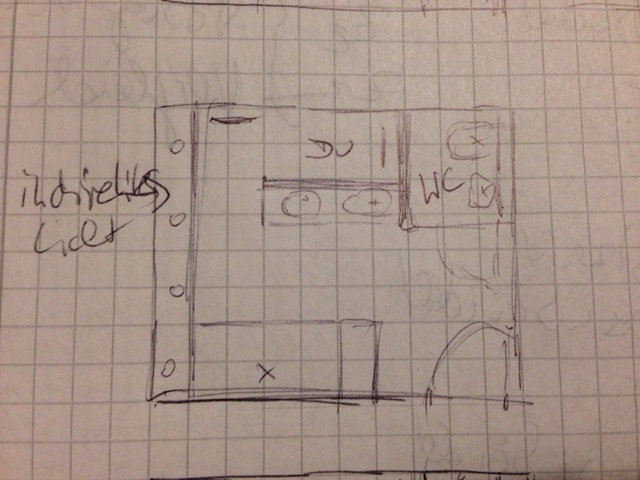 Je größer Du eine Vorplanung machst, umso ungenauer wird sie in Deinem Fall, weil Du Mauern als schmale Blätter zeichnest und auch Nachbarräume weglässt. Für Skizzen reichen kleine Entwürfe, für Detailzeichnungen sollte man dann in die Größe gehen. Mir persönlich fehlt ein Raster - ich kann Deine Schrift auch nicht lesen, trotz dass ich vor einem Bildschirm sitze.
