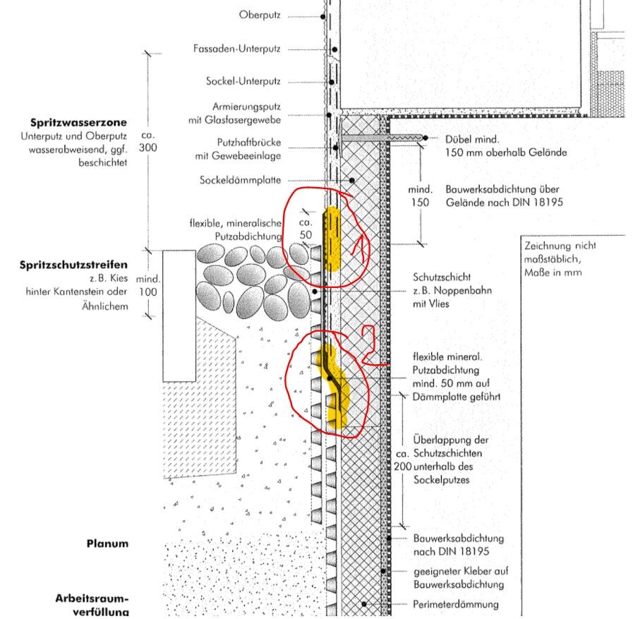 Genua, Noppenbahn hat nichts mit Abdichtung zu tun.Laut die Skizze aus Bild Sockel2 muss man so gar durchgehen vom Position 1 bis Position 2 abdichten.