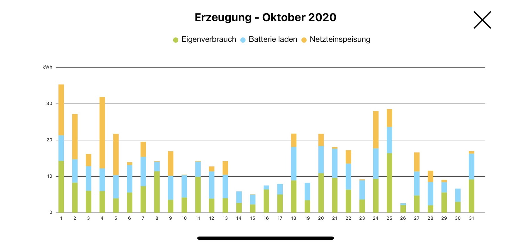 Mit meinem Speicher habe ich von Anfang April bis Ende Oktober kein Strom mehr gekauft. Da freut sich mein Versorger.Zeig mal bitte deinen Log. Würde mich mal interessieren. Bei uns um Nürnberg (und das ist nicht Hamburg) war der Oktober extrem beschissen. Habe den Speicher seit Anfang Oktober keine 10x voll bekommen.H