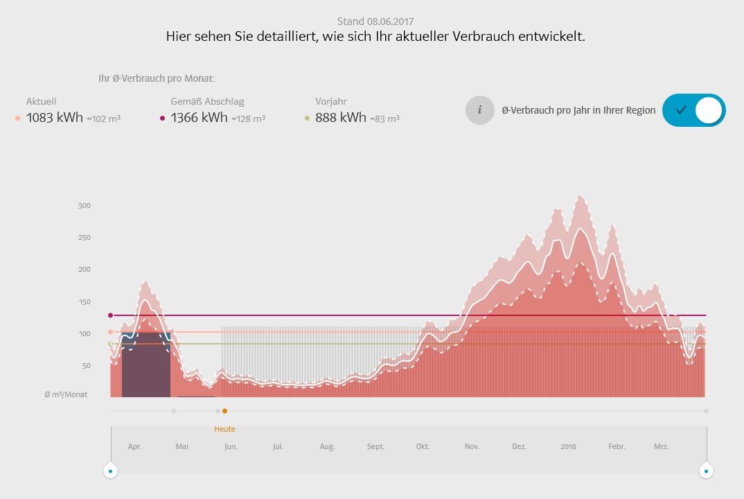 Hier als Beispiel 1000 Liter und 14 m². Seit Ende April bis heute, Mitte Juni, 1 m³ Gas in der Woche, wo es die ganze Woche geregnet hat. (erste Grafik)