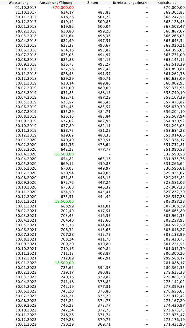 Wenn Du dazu am 15.10.2021 und 15.01.2022 jeweils weitere 18.500€ tilgst, liegt die Zinsersparnis schon bei rund 35.000€. Die letzte Rate wäre dann am 30.80.2047.