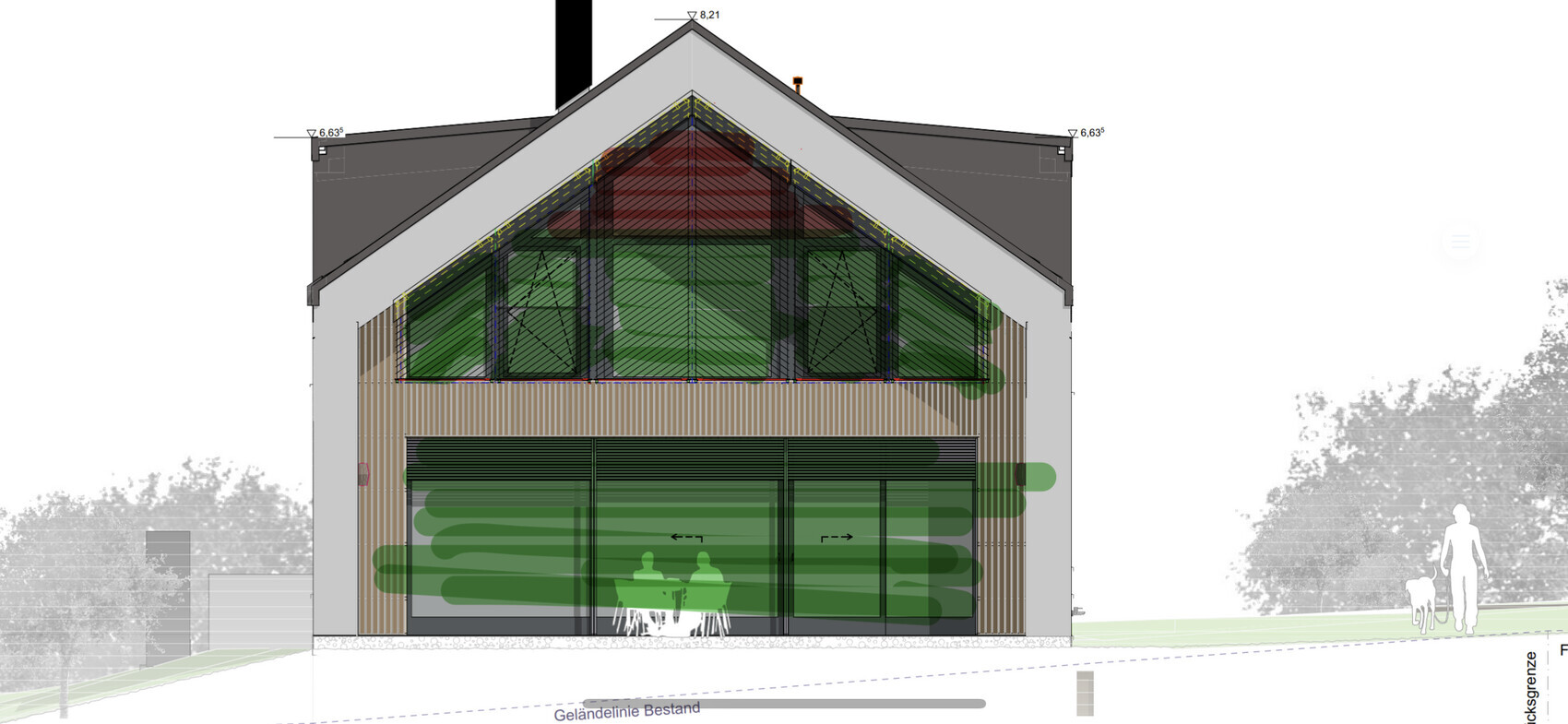 Wir haben die Fenster unterteilt und uns entschlossen nur an den entscheidenen Stellen die schrägen Giebel zu verschatten. Das obere Dreieck lassen wir sowohl an der Ost- als auch an der Westseite offen. Siehe Skizze (rot wird offen gelassen, grün verschattet). Wir gehen davon aus, dass der Dachüberstand auch einen gewissen Effekt für direkte Sonneneinstrahlung haben wird.