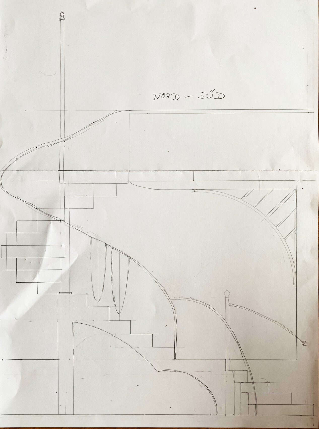 Hier von oben zu sehen. (der runde Kringel ist der tragende Pfeiler, ein zweiter wäre im Zentrum des zweiten gewendelten Teiles (auf der Zeichnung unten).