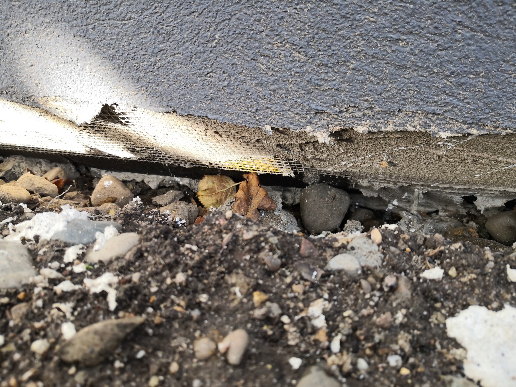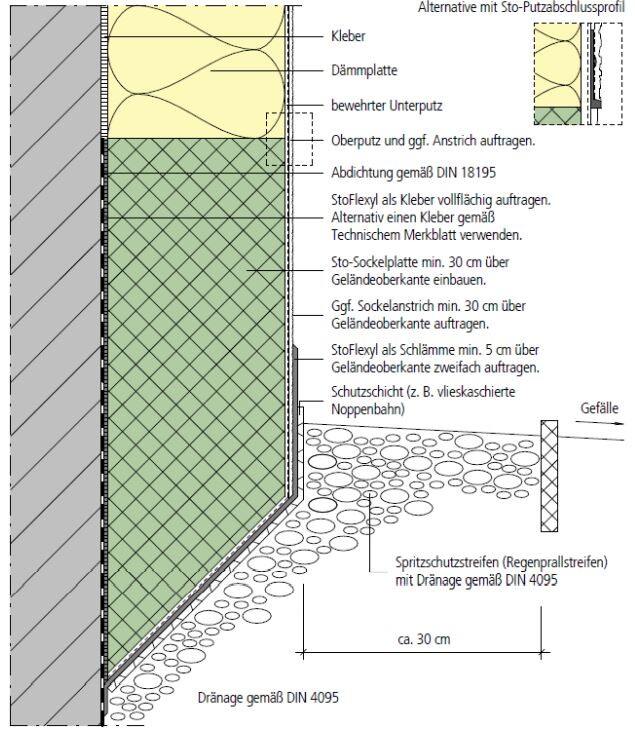 Was mir beim Betrachten der Bilder auffällt: Teilweise ist das WDVS ganz unten nicht komplett verputzt. Also der Teil, der später unter der Erde sein wird. Ist das schlimm?Ja, da kann Feuchtigkeit einziehen. Das solltest Du zuspachteln (wie auch im STO-Bild vorgesehen) und mit Dichtschlämme versehen.