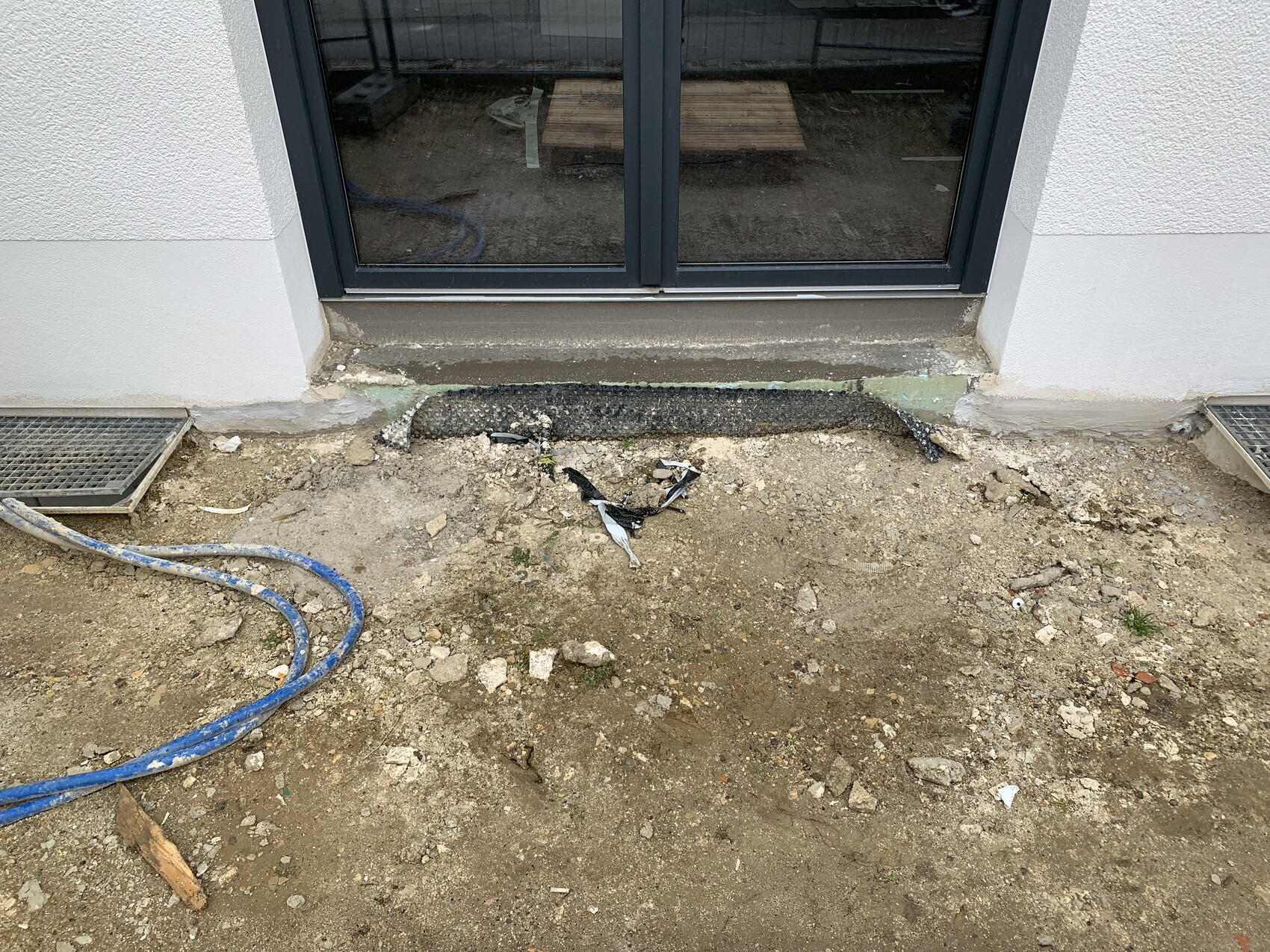 Die fertige Geländeoberkante ist die Unterkante der bodentiefen Fenster. Also bis dahin werden wir die Terrasse anlegen und auch einen Spritzschutz um einige Bereiche des Hauses anlegen.