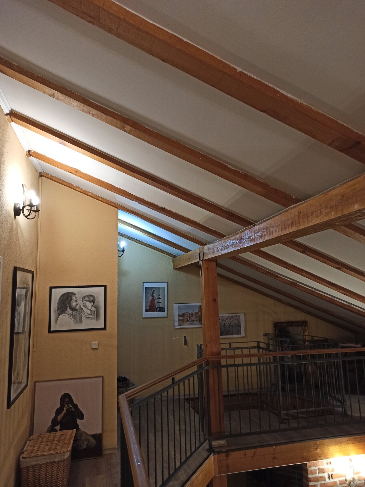 Die oberen beiden Stockwerke wurden damals zusammengezogen, unserer Meinung nach dienen die Balken an der Decke lediglich zur Dekoration, darüber dürfte sich eine weitere Konstruktion befinden - Bilder sind beigefügt.Auch das kann Dir niemand sagen. Ist ja auch noch im Ausland. Wer weiß, wie dort die Vorschriften sind.es sieht ja ziemlich neu aus und nicht tiefstes Entwicklungsland, daher gehe ich davon aus dass es dort auch Statiker gibt , die wissen was sie tun. Meiner Meinung nach muss die Wand stehen bleiben da sie die oberen Stockwerke abstützt. Das mit dem Dach habe ich nicht kapiert. Wenn es dort keine Schneelast gibt reichen auch wenige und dünne Balken als Dach.