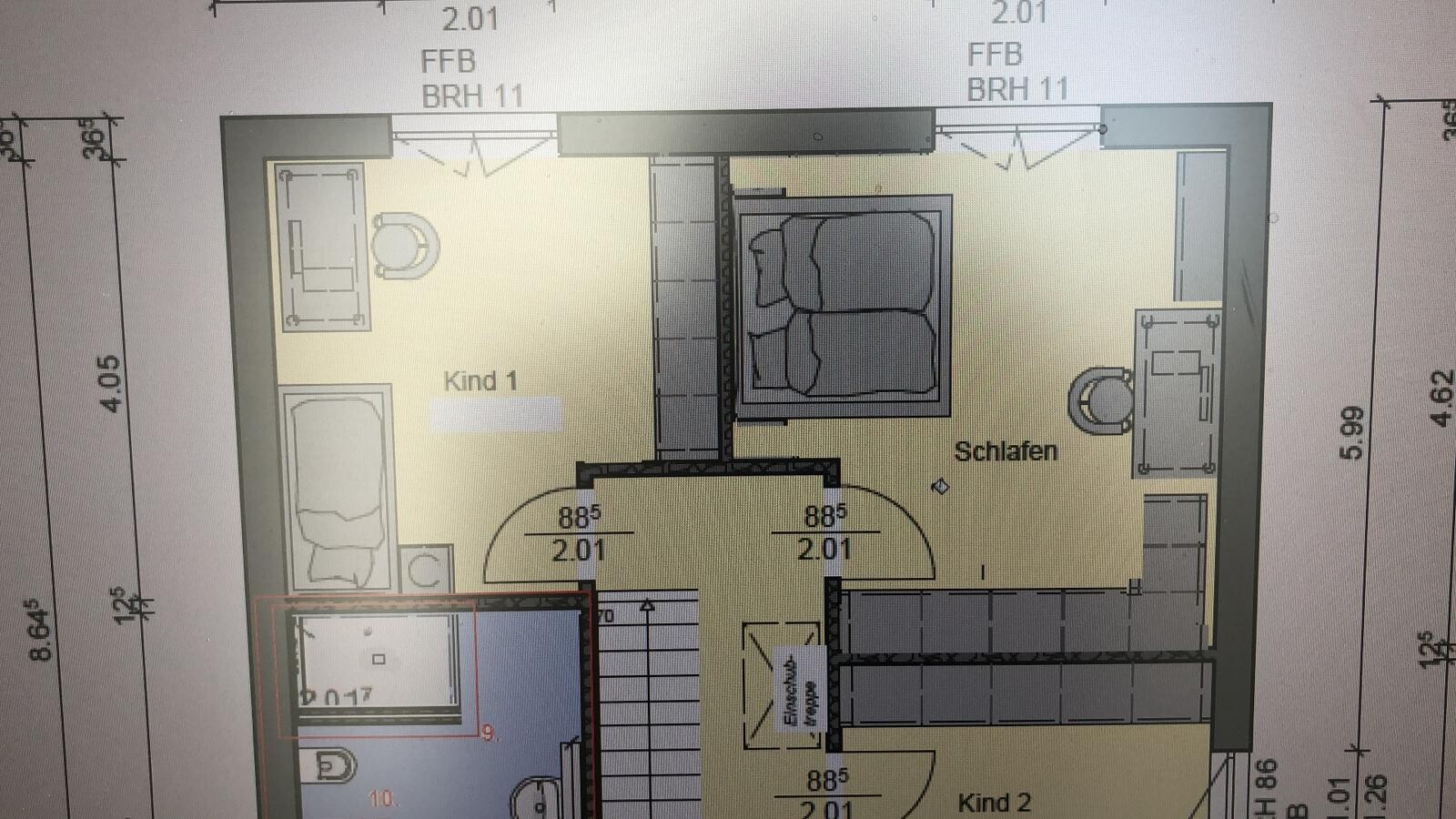 Bett bei Kind1 und Dusche muss man sich auch anschauen wegen Geräuschen. Aber Bad ist wahrscheinlich eh noch nicht fix.