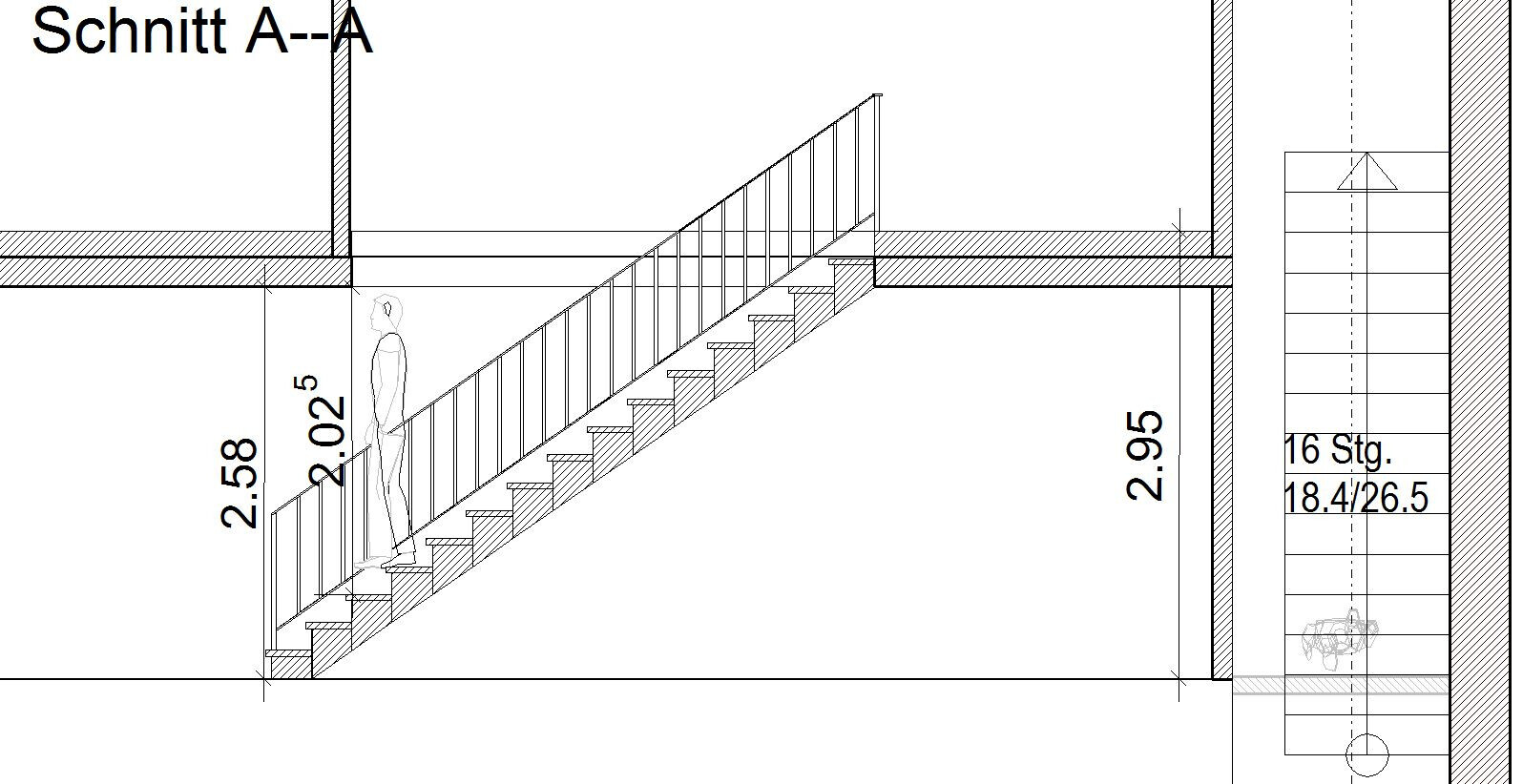 Im OG muss die Treppe mind. soviel wie in diesem Beispiel überbaut werden. Dadurch reduziert sich die Kopffreiheit im Bereich des Ausschnitts. Und, man bedenke, wie man eine Treppe runtergeht.