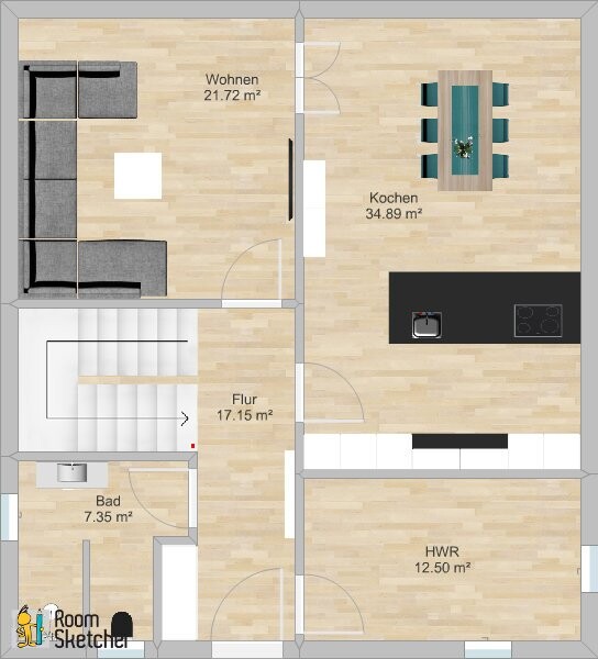 Grundriss: Wohnzimmer, Kochen, Flur, Bad, HWR; Treppe und Türen.