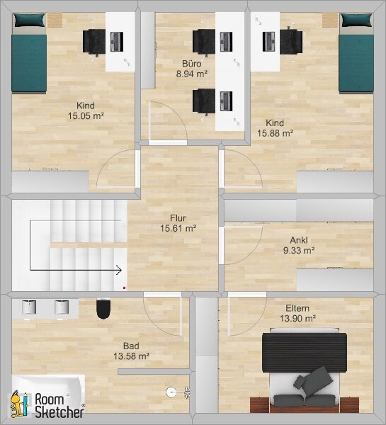 Grundriss eines Hauses: zwei Kinderzimmer, Elternzimmer, Büro, Ankleide, Flur, Bad, Treppenhaus.