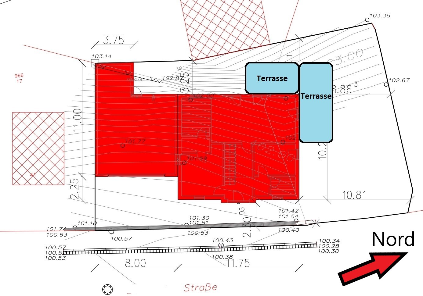 Lageplan: rote Gebäude, blaue Terrassen, Maßlinien und Nordpfeil