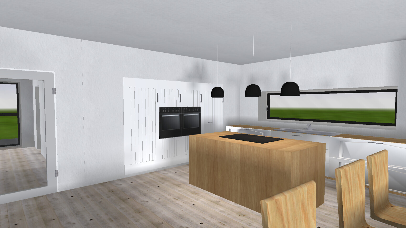 Alternativ wäre die Küche so möglich: Hinten könnte dann ein Einschnitt in die Hochschränke. Fenster könnte bodentief werden.