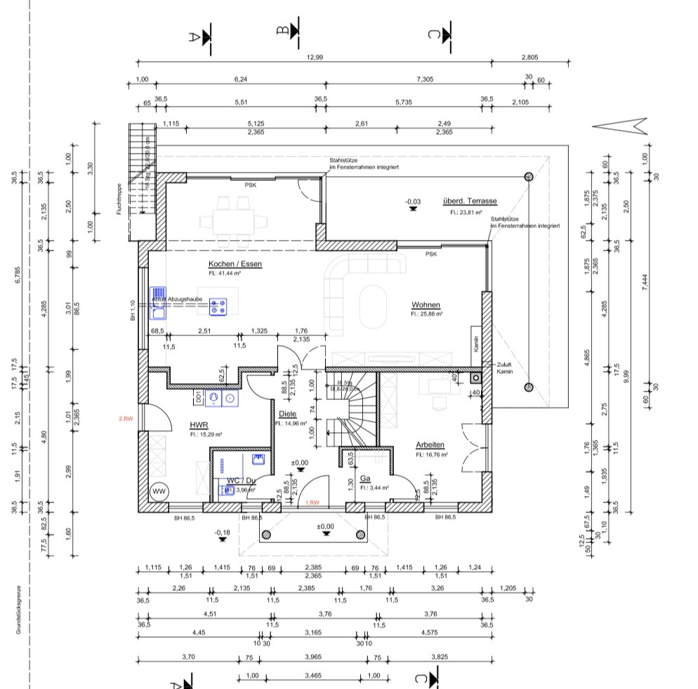 Wir sind in unserer Planung weiter vorangegangen. Uns haben hierbei die Kommentare aus der Familie aber auch aus dem Forum sehr geholfen, die eigene Meinung zu festigen. Basierend auf unseren Anforderungen sind jetzt die Fenster im EG erheblich größer geworden, der Kamin nochmals gewandert und bereits ausgeplant. Der Durchgang Küche zu Hauswirtschaftsraum wurde gestrichen und diverse Innenmaße angepasst. Der neu entstandene Balkon nebst Treppe ist einer Anforderung der Feuerwehr geschuldet, die wir vor Bauantrag in die Planung eingebunden hatten. Die Alternative wäre ein dauerhaft freizuhaltender Wendehammer nebst 16to Traglast auf der gesamten Zufahrt (80m) gewesen. Im Bad werden noch Details verschoben und die Position des Schornsteins ist für uns ein akzeptabler Kompromiss.