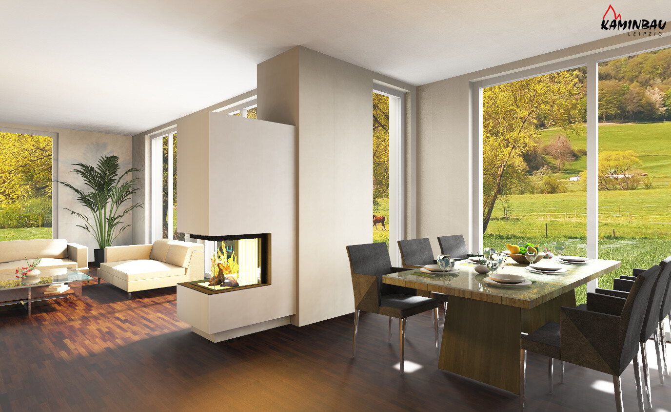 Offenes Wohnzimmer mit Kamin, Sofa links, Esstisch rechts, große Fenster zeigen Landschaft.