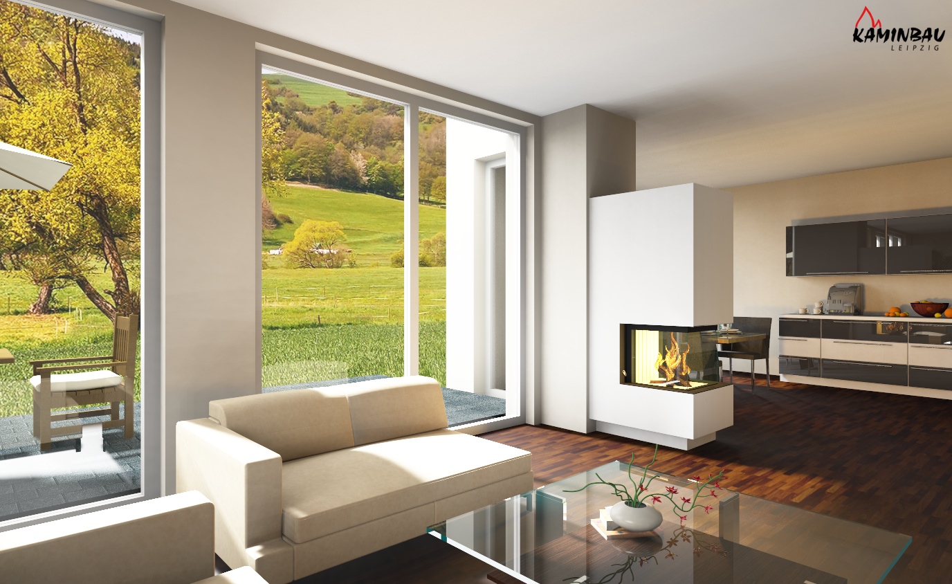 Modernes Wohnzimmer mit Kamin, Sofa, Glas-Tisch und offener Küche, große Fenster mit Blick ins Grün.