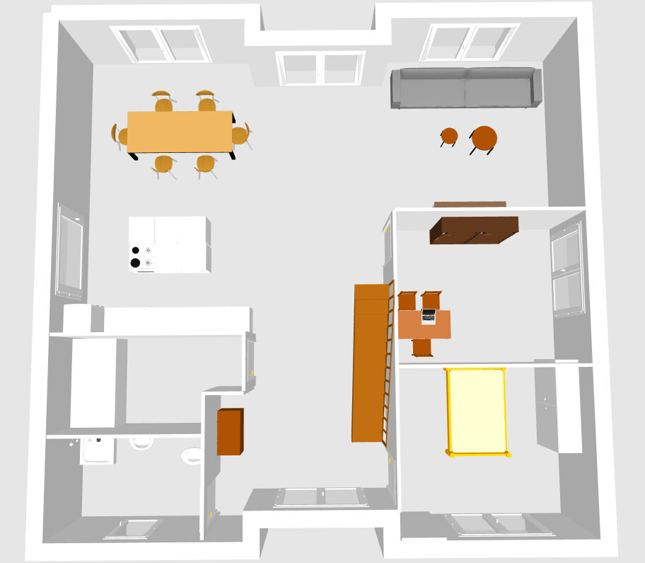 Grundriss einer Wohnung: offenes Wohnzimmer mit Sofa, Esstisch, Kücheninsel, Schlafzimmer, Bad.