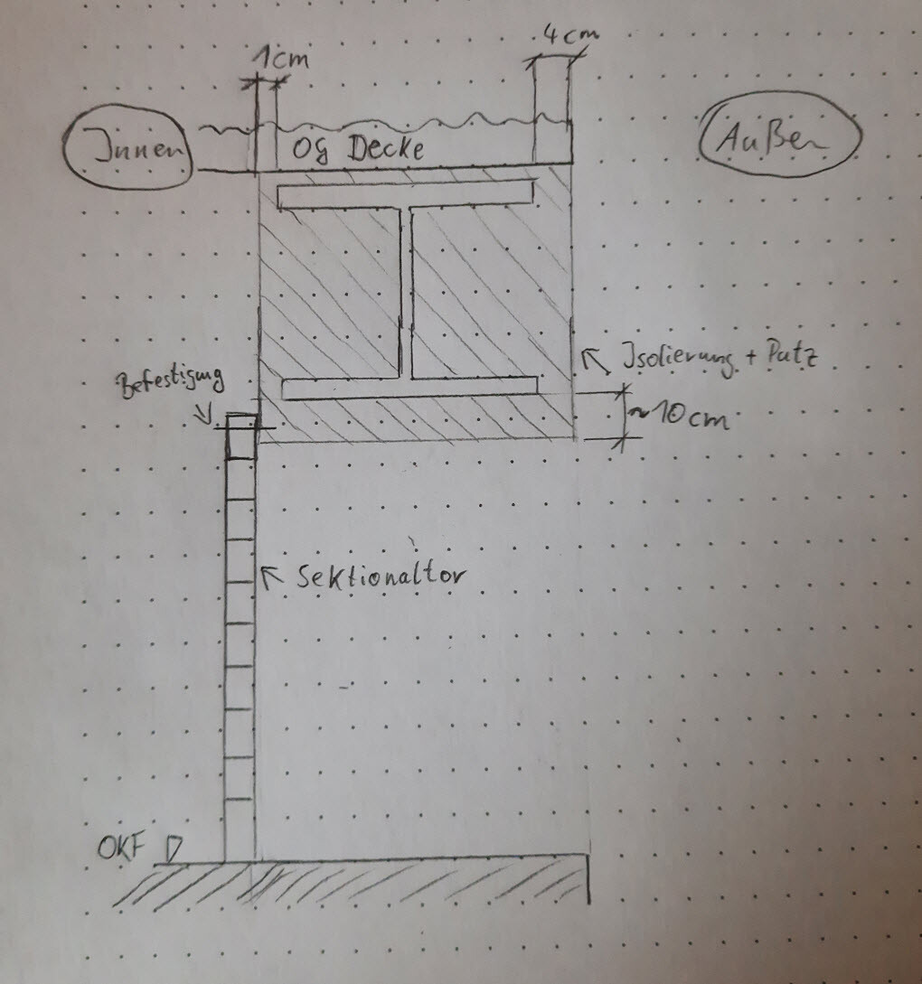 an einem Nebengebäude soll eine Wandöffnung auf 4m lichte Breite und 2,125m lichte Höhe für ein Garagen-Sektionaltor vergrößert werden bzw ist bereits vorhanden. Hierzu kommt ein IPE450 (!) ins Spiel. Beiliegende Skizze zeigt die Situation etwas anschaulicher - wobei diese leider nicht maßstäblich ist. Der Steg des IPE ist in Wirklichkeit deutlich höher und die Flasche dazu im Vergleich ehr kurz, daher täuscht die Abbildung etwas. Außen und Innen wird dann überputzt. Innen muss aber der Rahmen des Tores oben befestigt werden.