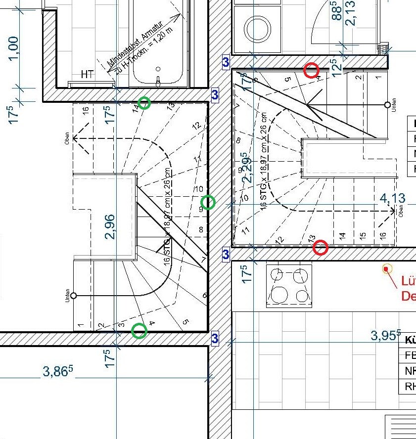 Zuvor war die Treppe an den roten Punkten in der Wand gelagert, die von meinem Nachbarn an den grünen Punkten. Das war den beiden (Bauträger und GU) dann doch zu heikel und vor der Schallmessung wurde die Treppe so aufgebaut, dass sie nur auf dem Boden und in der Decke gelagert ist, aber nicht mehr an den Wänden.