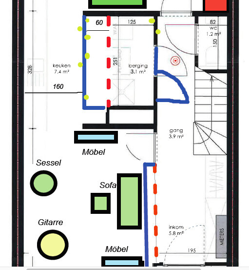 Um auf jeden Fall genug Stauraum zu haben, wird die Wohzimmerwand um eine Schuhlänge nach links/innen gerückt.