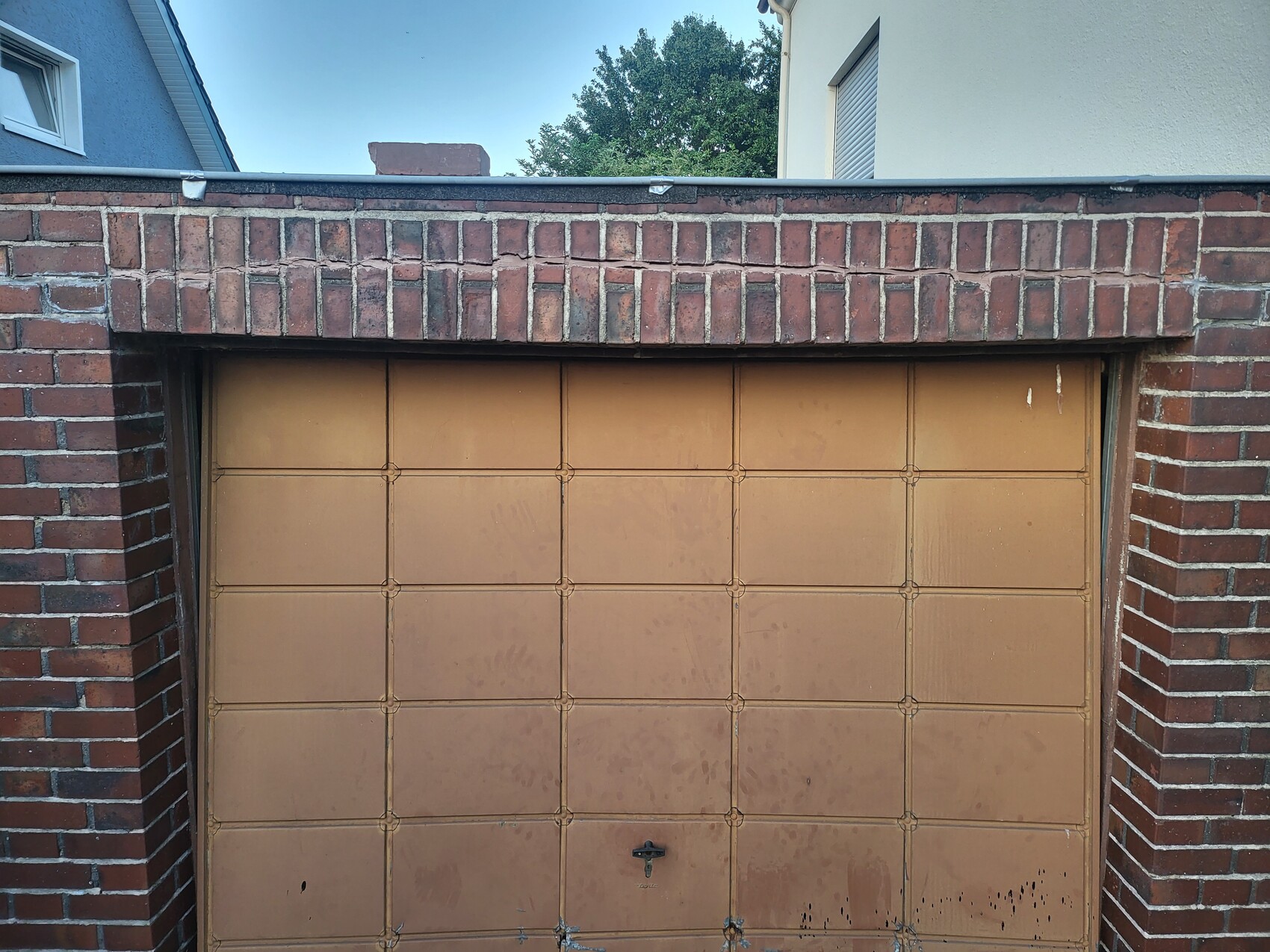 Man sieht einen etwas rostigen Stahlträger und ebenfalls einige Risse an den Seiten. Über dem Garagentor scheint sich das Mauerwerk unter dem Stahlträger von diesem gelöst zu haben.