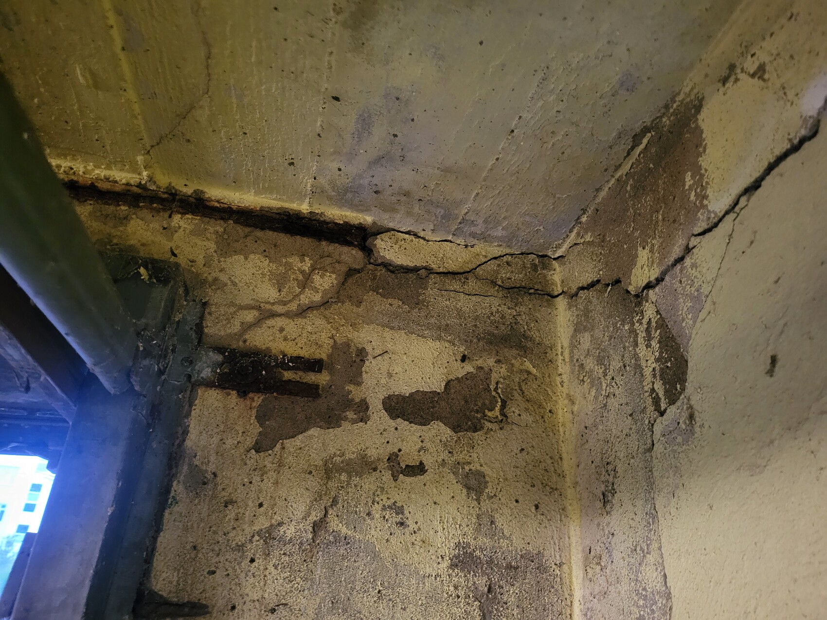 MMn sollte die Betondecke das Bauwerk zusammen halten. Die gebrochenen Ziegel haben einen Bogen gebildet, der nach außen drückt. Wenn diese Ziegel entfernt werden sollte die Gefahr gebannt sein.