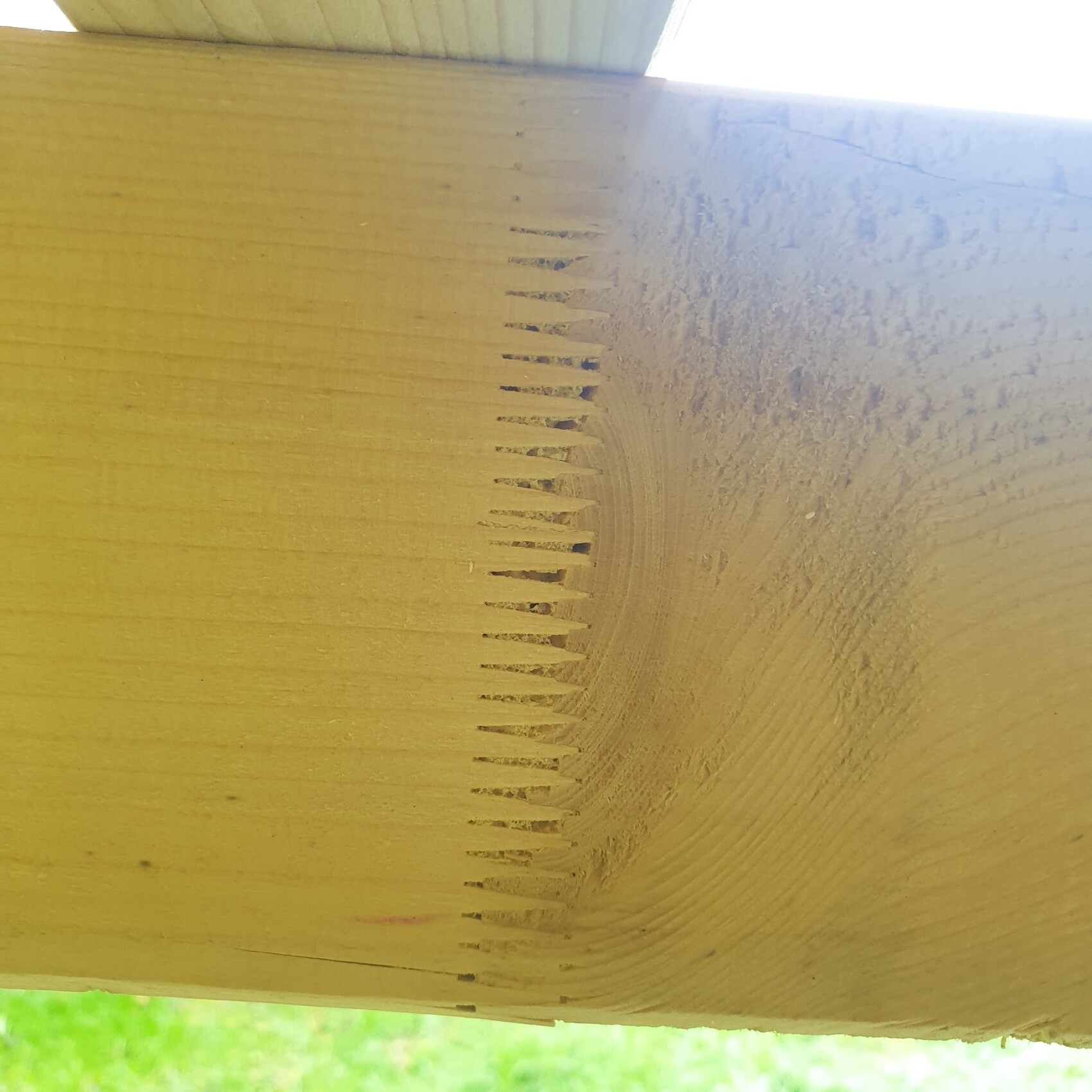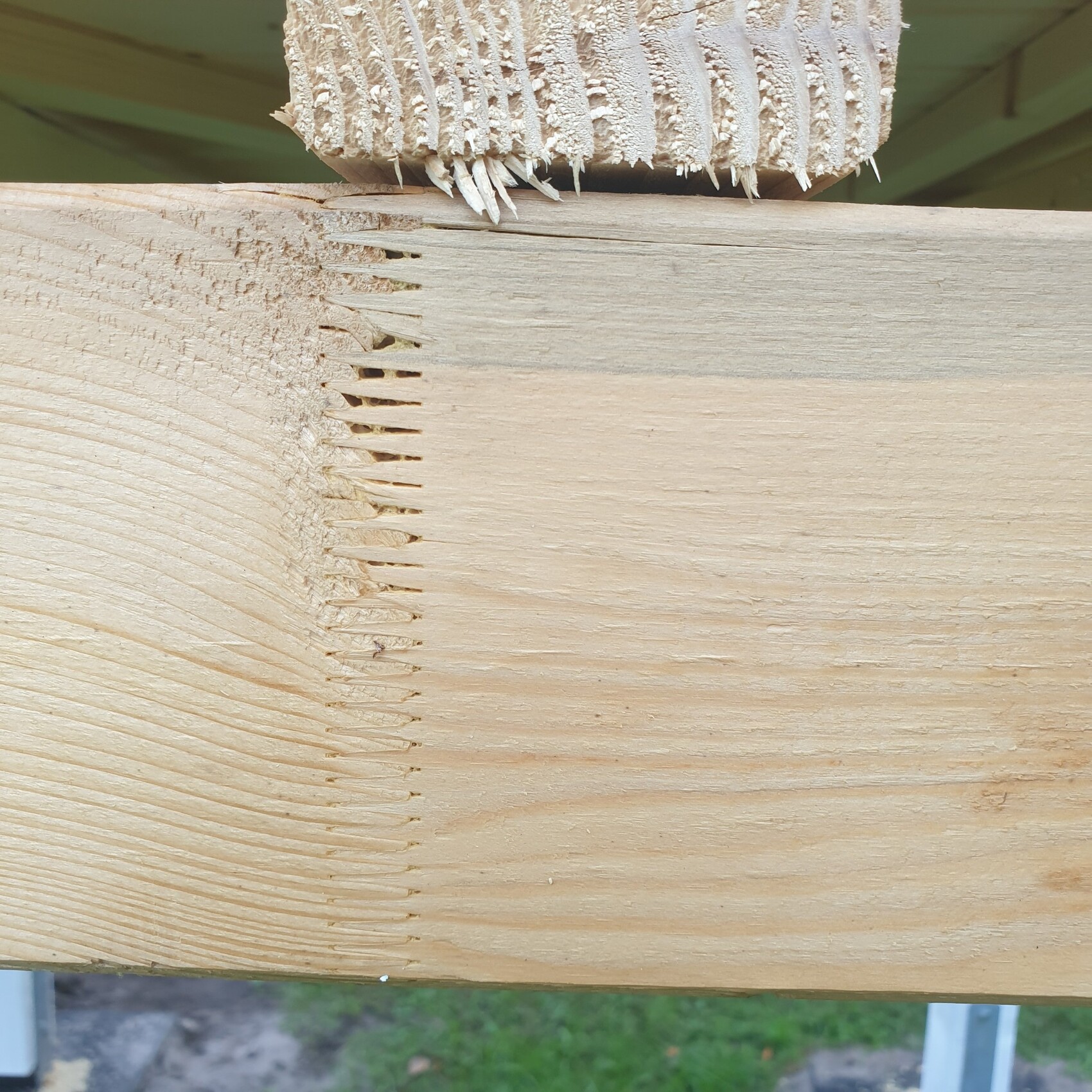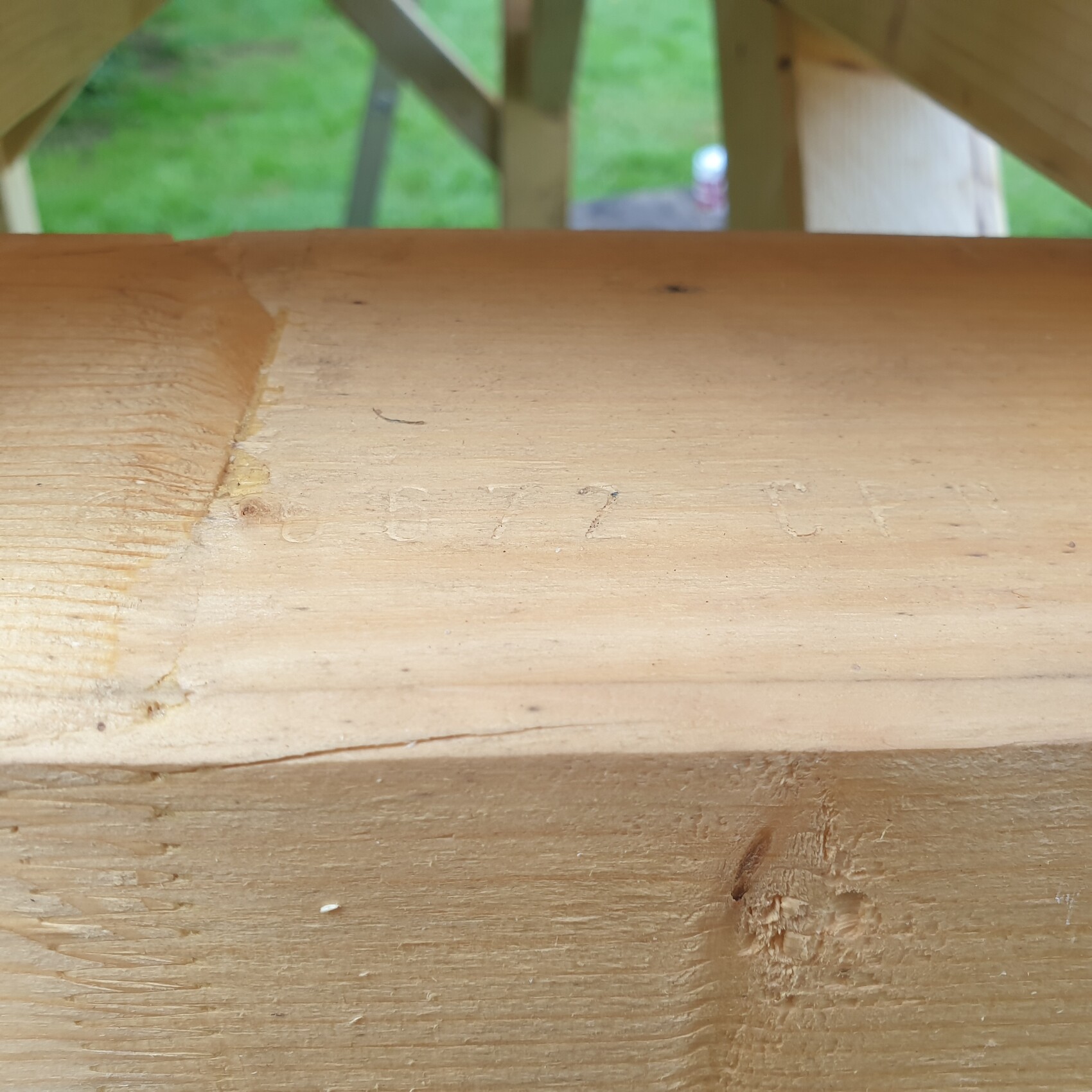 ich hoffe ihr könnt mir weiter helfen. Wir haben gerade ein Spielhaus gebaut bzw teilweise bauen lassen. Wichtig ist mir natürlich die Sicherheit, also dass alles sehr stabil ist, darum habe ich auch auf 6 12x12 Balken bestanden obwohl der Handwerker das übertrieben fand (das Haus hat 3x2 Meter und ca 300 Kilo Gewicht). Jetzt wollte ich den Schutzanstrich starten und habe "so komische Zinken", die für mich nicht ganz korrekt aussehen bei der 2 Meter-Überspannung gefunden. Das untere Gerüst hat uns komplett ein Handwerker gebaut und das Material besorgt. Habe dann diese Zinken gegoogelt und große Bedenken ob unser Querträger schadhaft ist und die Statik schwächt. Hoffe ihr könnt mich beruhigen, ich dachte ich hätte alles statisch überdimensioniert geplant und dann sowas. Das erste Bild zeigt die Stelle, dann kommt zweimal der Stempel auf dem Balken, der mir leider nichts sagt ausser dass es nach einem CE-Kennzeichen Aussicht. Dann die potentiell schadhafte Stelle von innen und das Spielhaus.