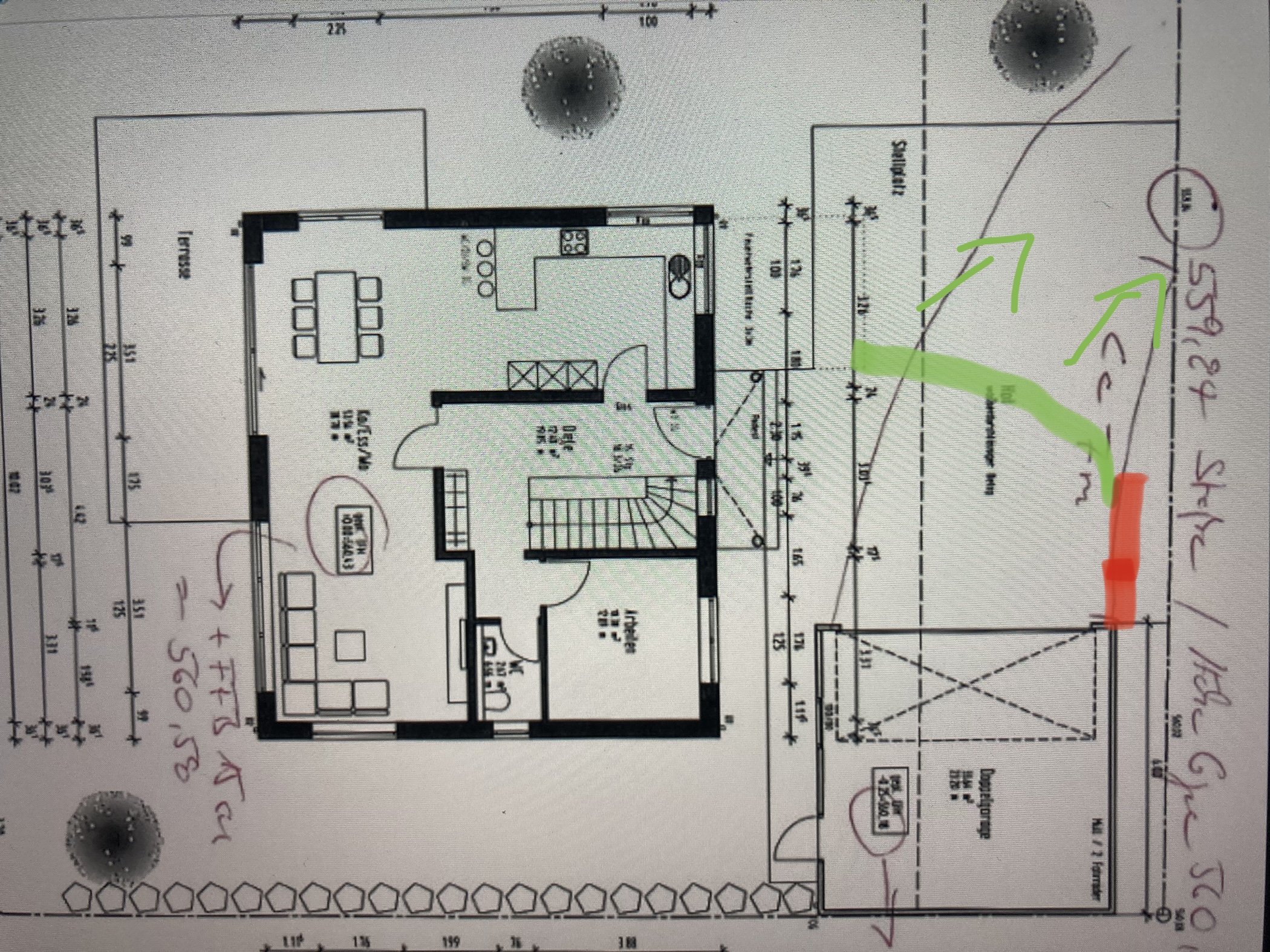 Hab mich glaube aber vorher schlecht ausgedrückt. Alternativ wäre die Garage höher setzen und im roten Bereich eine Mauer um den Höhenunterschied auszugleichen und ab dem grünen Bereich Gefälle zur Straße. Ein Gefälle kann ja ein fließender Übergang sein und muss in 2D gesprochen keine rechten Winkel haben.