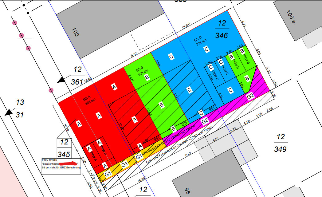 wir haben ein Grundstück erworben, auf dem entweder eine Doppelhaushälfte oder ein Reihenhaus mit drei Einheiten entstehen soll. Inzwischen haben wir die Bauantragszeichnungen erhalten. Dabei sind die Stellplätze allerdings außerhalb des Baufensters eingezeichnet."Finde" den Fehler (in lila Fettdruck markiert). Um welche Flurstücksnummer soll es sich den handeln ?Dem Vorschlag "Zeichnungen zeigen" schließe ich mich an.